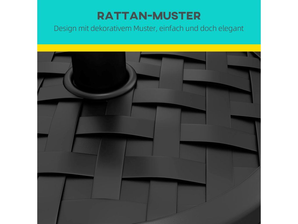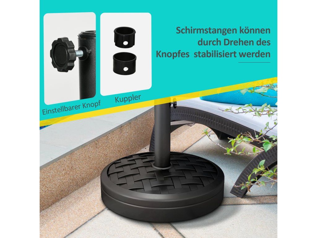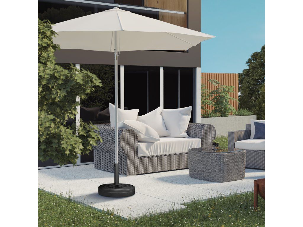 Vhodná velikost tyče: Základna slunečníku je vhodná pro slunečníky s maximální výškou 2,5 m a průměrem tyče 32 mm, 38 mm nebo 48 mm.