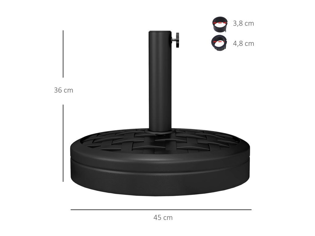 Informace o stojanu na slunečníky: Rozměry: Ø45 x 36 cm. Čistá hmotnost: 18 kg. POZNÁMKA: Změřte si prosím předem průměr tyče slunečníku, abyste se ujistili, že naše základna dobře sedí.