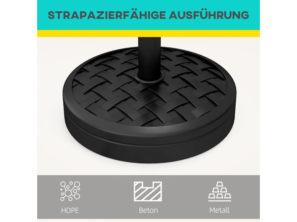 Závažný stojan na slunečník drží váš slunečník bezpečně a stabilně na místě, což mu umožňuje poskytovat tolik potřebný stín. Skořepina je vyrobena z odolného plastu HDPE a je vyplněna betonem pro zvýšení hmotnosti. Kovová tyč s práškovým lakem drží slunečník bezpečně a uzamykací tlačítko poskytuje dodatečné zabezpečení.