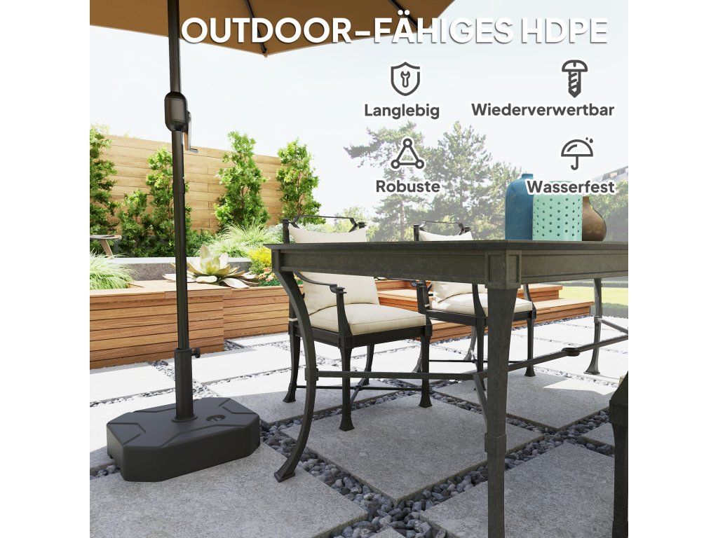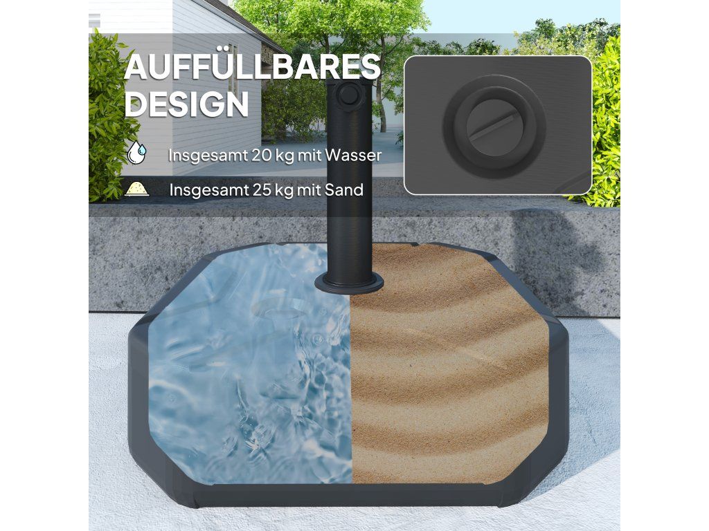 Plnitelný design: Tento zahradní stojan na deštník nabízí díky plnitelnému designu větší stabilitu. Vyberte si mezi plněním pískem (až 25 kg) pro větší stabilitu nebo plněním vodou (až 20 kg) pro snadnější manipulaci. Rozhodněte se, co vám nejlépe vyhovuje.