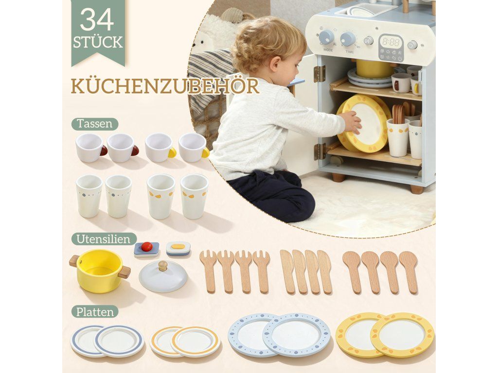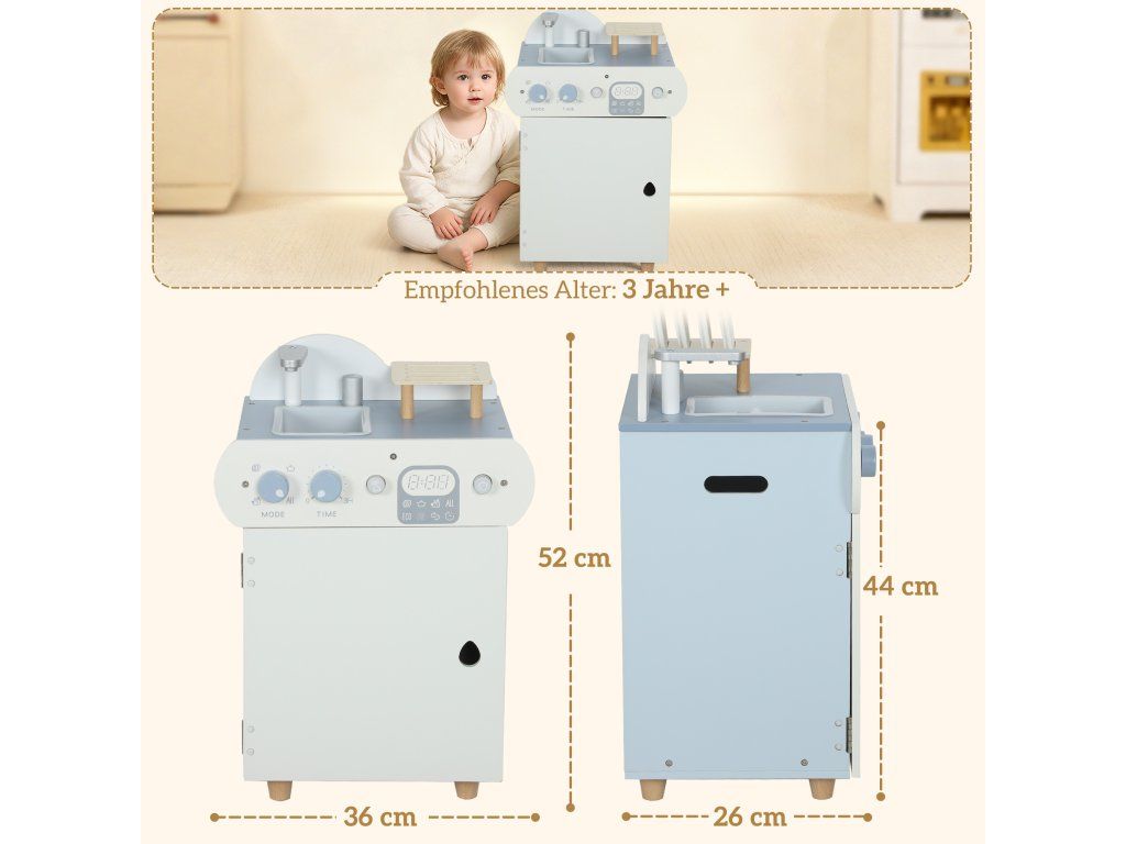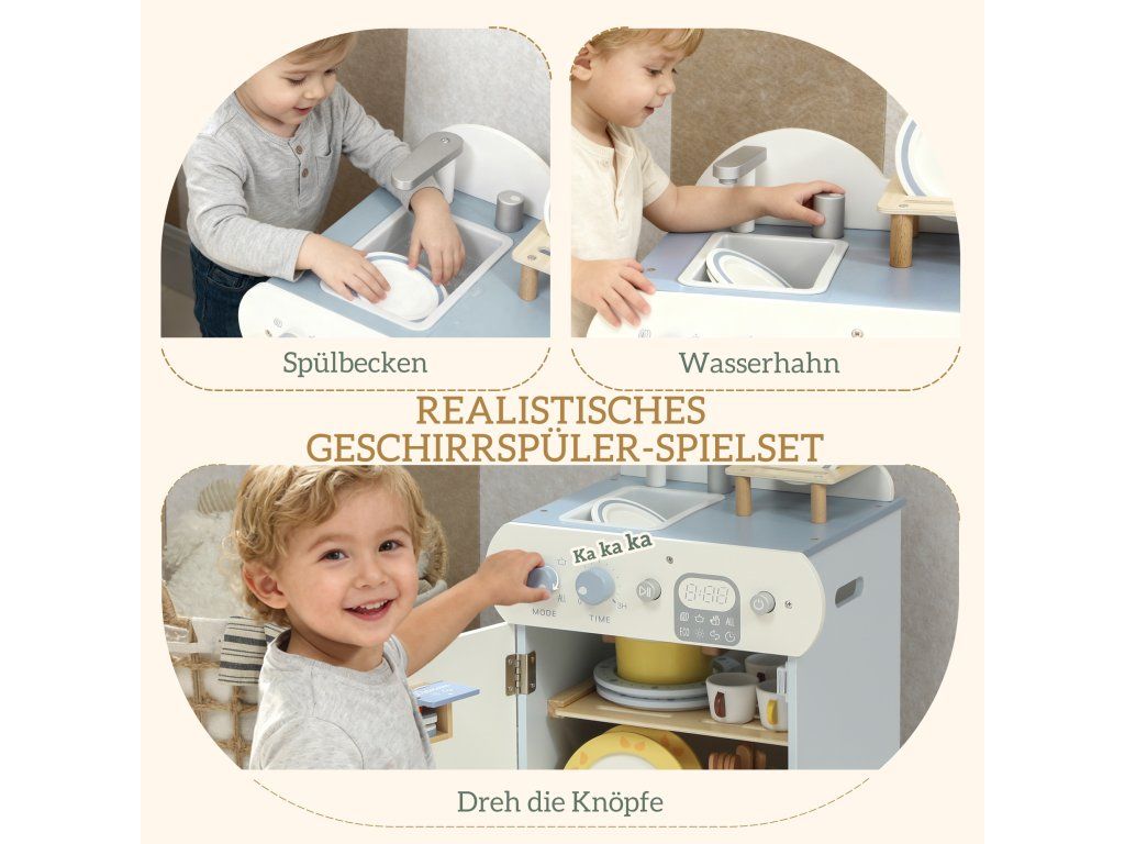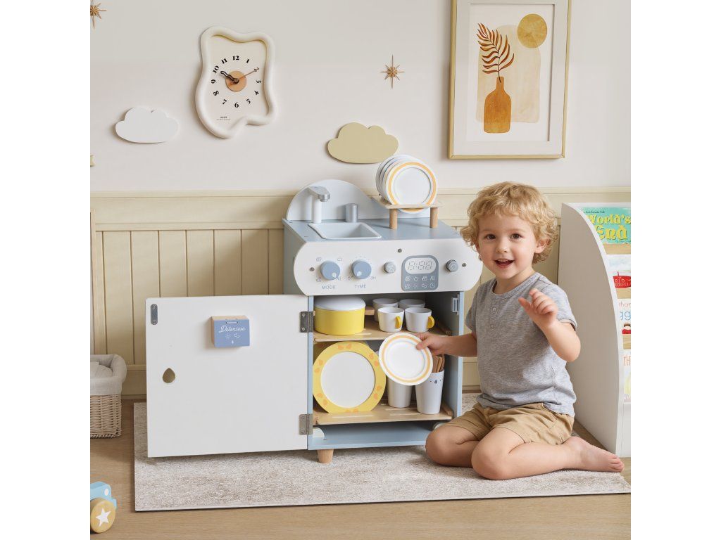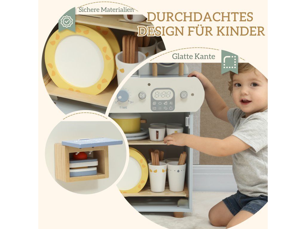 Máte obavy, že si vaše dítě neustále hraje s obrazovkami nebo v potenciálně nebezpečných kuchyňských prostorách? Chcete podpořit jeho sklon napodobovat úkony dospělých, ale nemůžete najít vhodnou alternativu? Sada kuchyňských hraček je řešením. Tato dětská kuchyňská sada obsahuje dřevěnou myčku nádobí a 32 dílků v pevné, hladké dřevěné konstrukci pro bezpečné a kreativní hraní rolí.