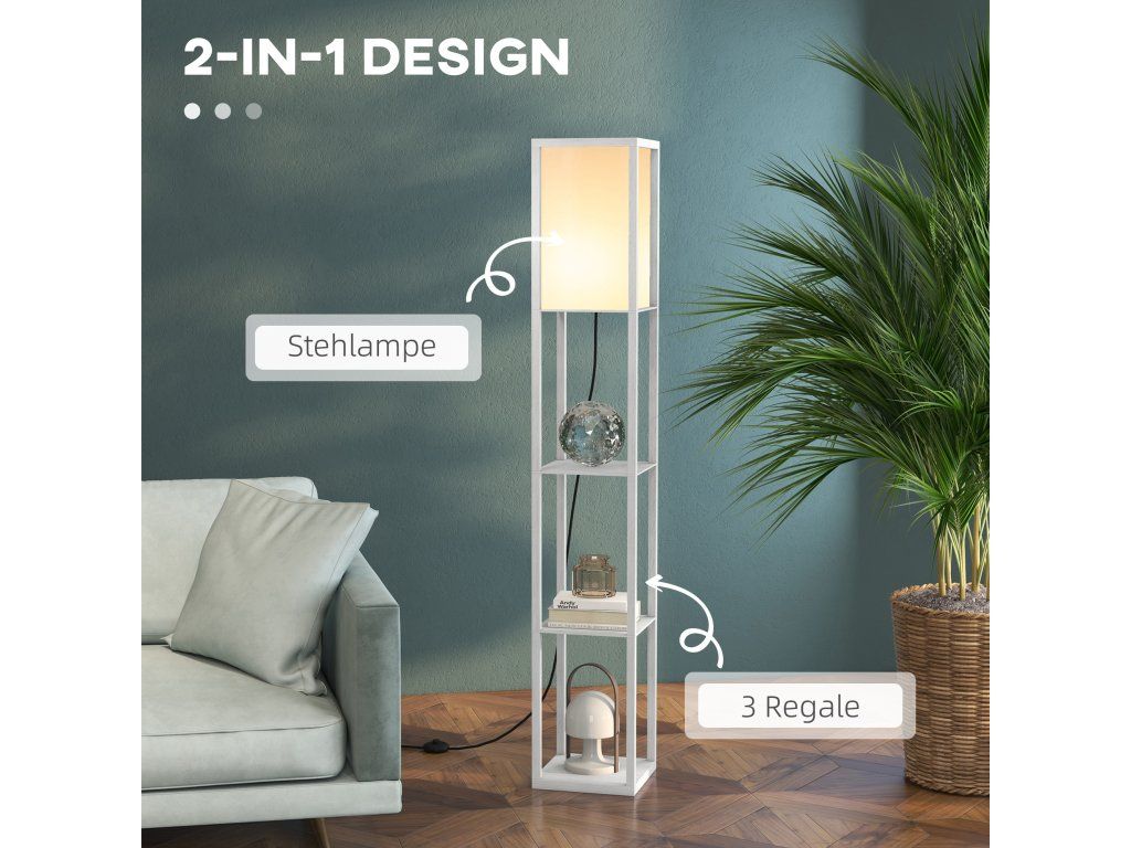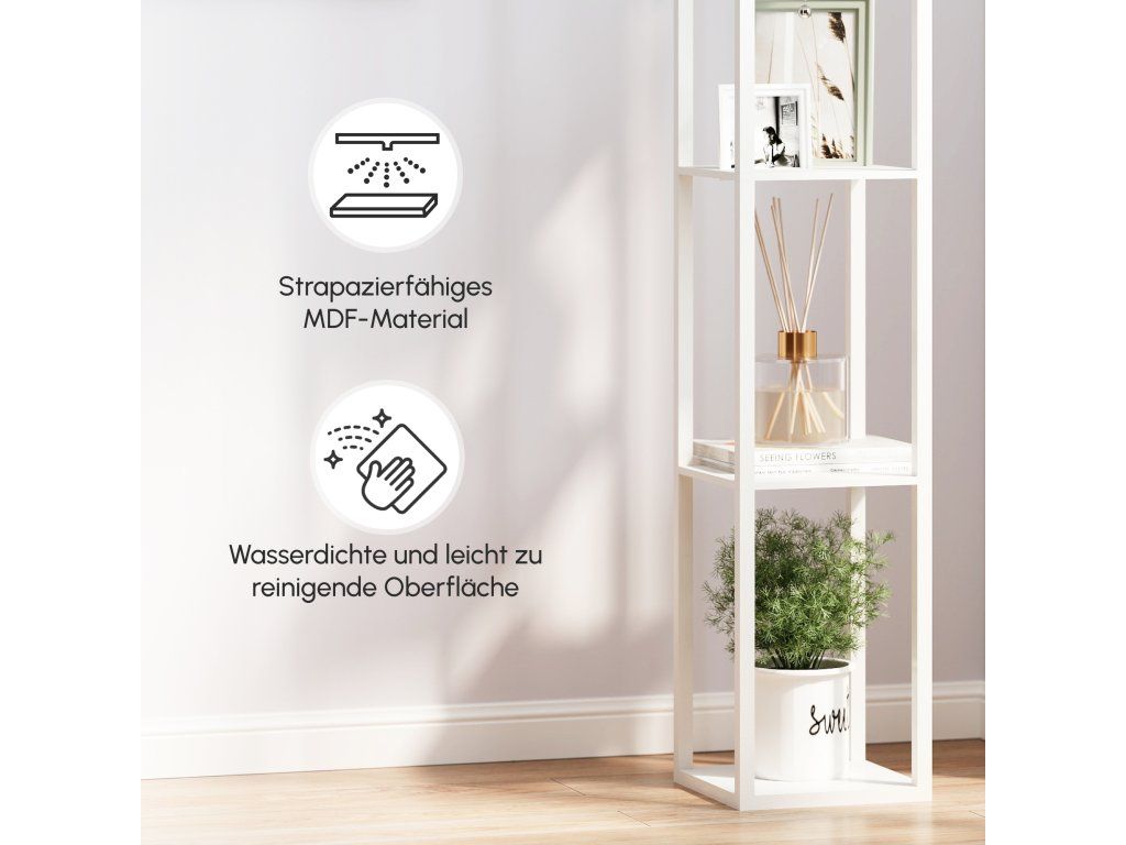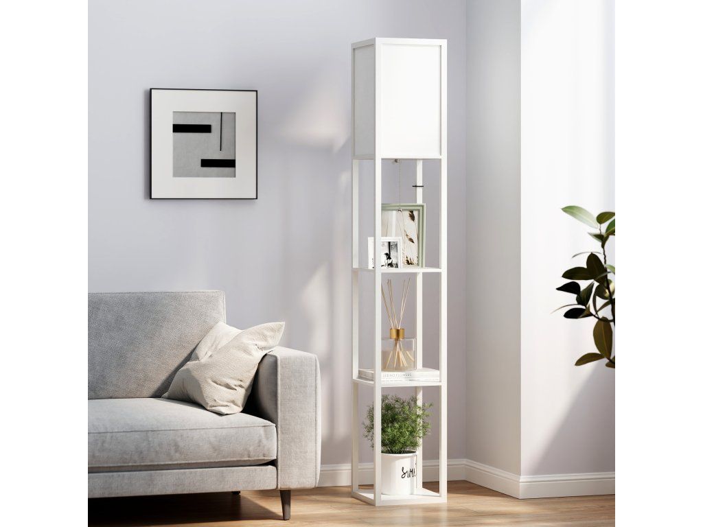 Naše elegantní a funkční stojací lampa spojuje stylový úložný prostor s jemným, příjemným osvětlením. Díky třem otevřeným policím nabízí ideální místo pro vystavení knih, dekorací nebo pokojových rostlin, zatímco integrované světlo vytváří útulnou atmosféru v obývacím pokoji i ložnici.
