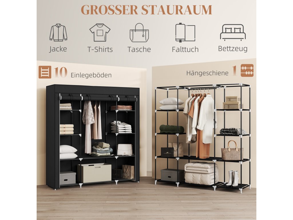 S touto přenosnou látkovou šatní skříní můžete ve své ložnici zdůraznit jednoduchost. Díky praktickému a prostorově úspornému designu můžete šatní skříň umístit do ložnice, obývacího pokoje nebo kamkoli jinam, aniž byste se museli obávat, že by narušila výzdobu vašeho domova. Deset otevřených polic a jedna závěsná tyč poskytují dostatek prostoru pro vaše oblečení. Podšívka z netkané textilie chrání vaše věci před prachem.