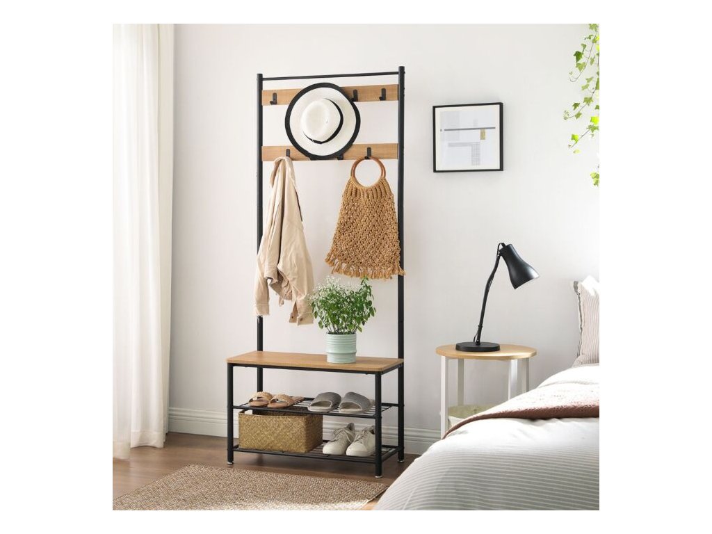 Věšák 3 v 1 Háčky na kabáty, lavička na boty a botník - tato univerzální úložná jednotka v předsíni vyhovuje všem vašim potřebám pro zavěšení oblečení, uspořádání bot. a posadit se, abyste si mohli obout nebo vyzout boty.9 robustních háčků 9 nerezových kovových háčků ve 2 řadách, z nichž každý unese až 3 kg, jsou robustní a odolné a nabízejí spoustu místa pro zavěšení kabátů, tašek, klobouků, šátků. a další předměty s sebou - ideální pro dlouhodobé použití.Robustní a stabilní Tento stojan na kabáty do předsíně se opírá o robustní ocelový rám a je vyrovnán pomocí 4 nastavitelných nožiček; přiložená sada proti překlopení zvyšuje celkovou stabilitu;Lavice na boty s policemi Lavice tohoto stojanu na kabáty vám díky nosnosti 90 kg umožní klidné sezení. Můžete ji také použít jako úložnou polici na krabice na boty a úložné boxy nebo na vystavení rostlin a dekorací.Snadná montáž Díky jednoduché konstrukci, očíslovaným dílům a jasnému návodu můžete tento věšák s úložným prostorem na boty bez problémů sestavit [Poznámka] Z důvodu bezpečnosti. nezapomeňte výrobek připevnit ke stěně pomocí přiložené sady proti překlopení.| Kategorie: | Předsíňové stěny |