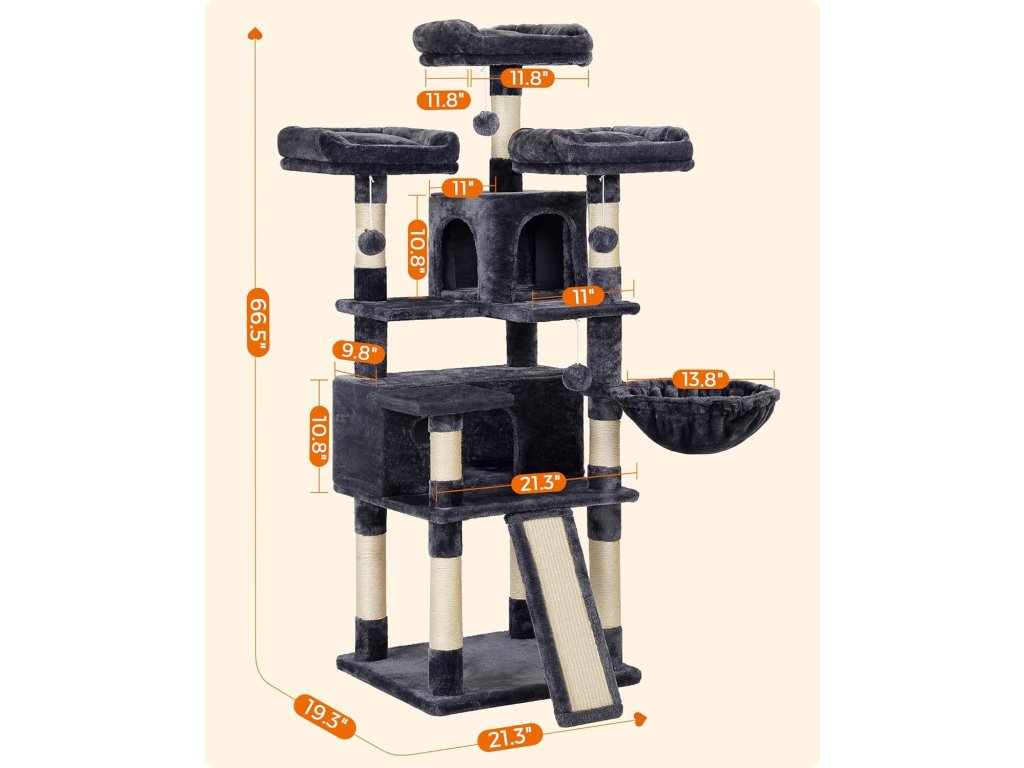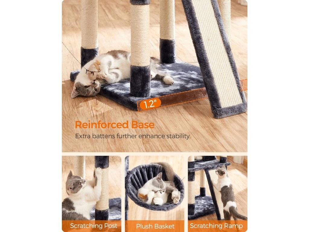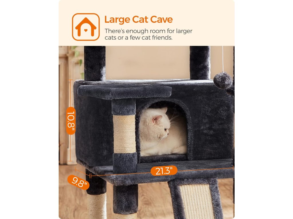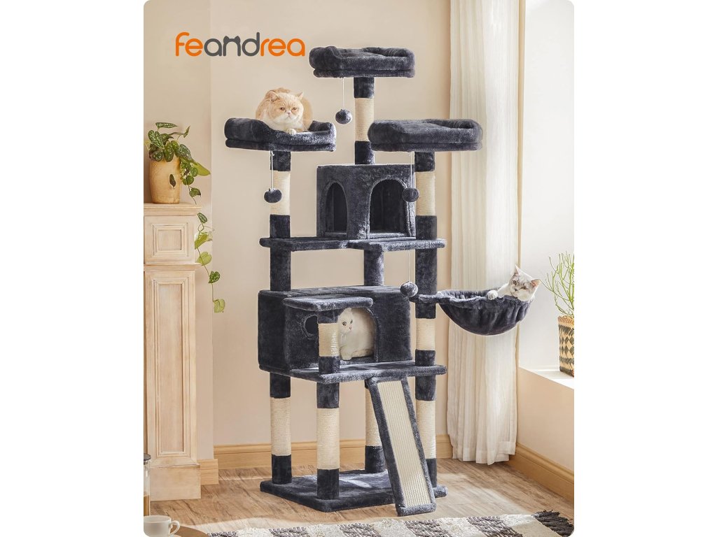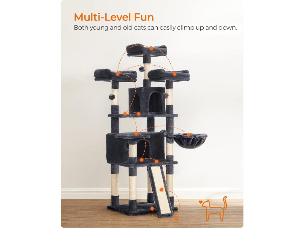 Speciální velikost: V čem je tento kočičí strom jiný? Velikostí! S výškou 172 cm nabízí výjimečný domov pro vaše kočky. Díky uspořádání schodiště po něm mohou malá koťata i staré kočky šplhat jako profesionálové.Prázdninový tábor: 3 velké plošiny, 2 jeskyně, 1 koš a 3 chlupaté koule... tolik aktivit! Je to skutečný prázdninový tábor s veškerým komfortem, který vaše kočky potřebují po celý rok, a není v něm místo pro nudu.Bavte se a buďte v bezpečí: Mají vaše kočky rády divoký život? Pusťte se do toho! Díky zesílené základně a sadě proti převrácení je tento škrábací strom vždy stabilní, i když na něj skočí 3 kočky.Zachraňte svou pohovku: Díky velké odolné škrabací desce a škrabacím sloupkům prodlouží tento kočičí domek výrazně životnost vaší pohovky a tapet.Udělejte svým kočkám radost: Kočky si mohou hrát a odpočívat v pohodlí, když jste pryč: Rozmazlujte své kočky tímto škrabacím stromem, aby se necítily osamělé, když jste pryč.| Kategorie: | Škrabadla pro kočky |