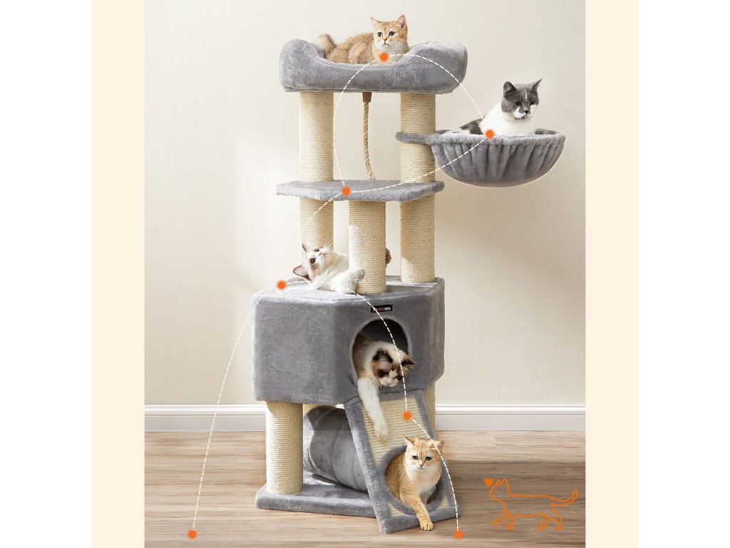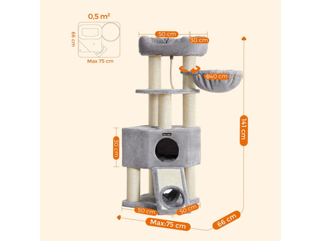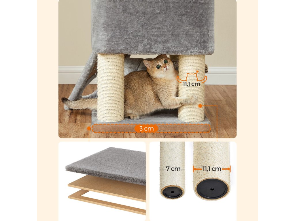 Prostorný: Tento kočičí strom má plošinu o rozměrech 50 x 50 cm, plyšovou jeskyni o rozměrech 50 x 50 x 30 cm a velkou houpací síť (průměr 40 cm), která je vhodná zejména pro baculaté kočky.Odolný a stabilní: díky velké základně (50 x 50 cm), silným sloupkům (průměr 11,5 cm) a dřevěným latím nabízí tento kočičí nábytek vysokou stabilitu pro divoké skákání. Dodávaná ochrana proti překlopení zajišťuje dodatečnou bezpečnostVhodné až pro 5 koček Víceúrovňové škrabadlo unese celkem až 83 kg a je vhodné pro více koček. Na plošině pro pozorování, v houpací síti pro odpočinek nebo na sisalových sloupcích a škrabadle pro broušení drápků.Snadné čištění, snadná instalace: kryt plošiny je odnímatelný a lze jej ručně prát; všechny šrouby jsou univerzální, škrabadlo pro kočky může namontovat jedna osoba pomocí dodaného imbusového klíče;Nekonečná zábava Kočičí tunel, škrabadlo s otvorem, závěsné sisalové lano, houpací síť a plošina - tento všestranný kočičí strom s dostatkem prostoru poskytuje nekonečnou zábavu pro vaše chlupaté přátele.| Kategorie: | Škrabadla pro kočky |