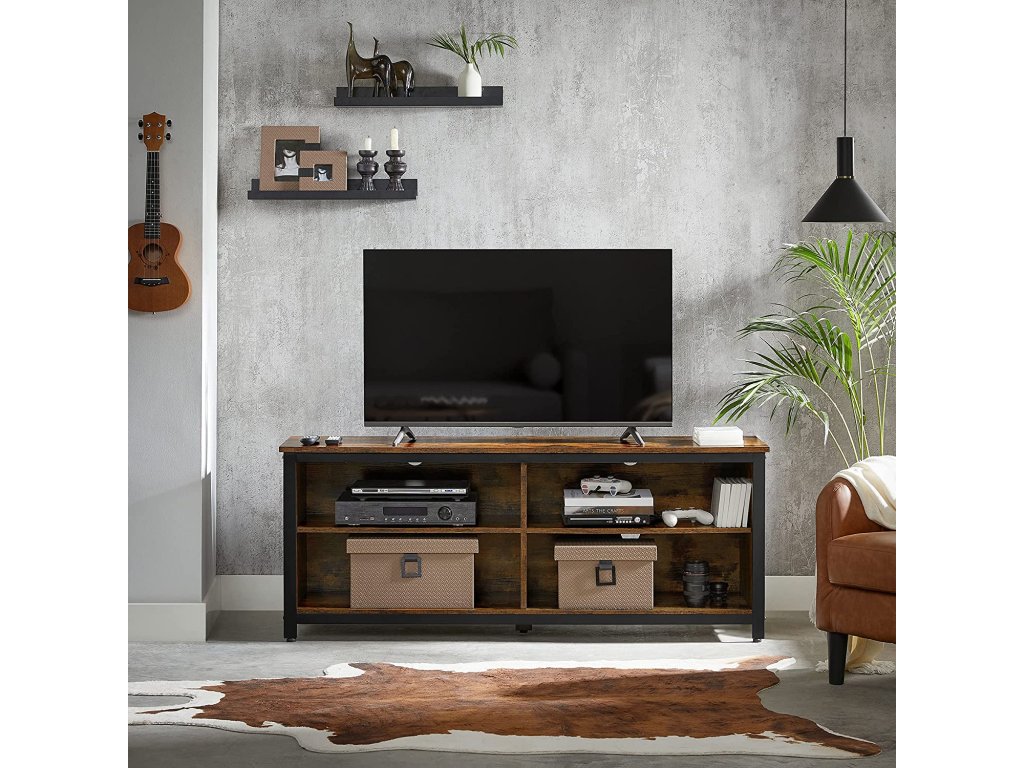 Televizní stolek, skříňka se 4 policemi pro televizory s úhlopříčkou až 65 palců, televizní stolek s nastavitelnými policemi a systémem vedení kabelů, průmyslový, rustikální hnědý a černý.