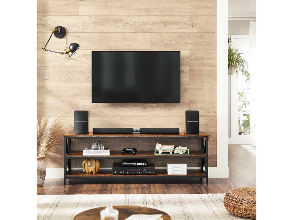 Farmářský styl je tady: Nemusíte žít na venkově, abyste si mohli splnit svůj sen o venkovském domě. Tento televizní stolek se 3 rustikálními hnědými prkny vyztuženými černými bočními rámy ve tvaru písmene X přináší uklidňující atmosféru statku, která doplní vaše každodenní chvíle u televize.Čas na ukázku: Pokud jste na své věci pyšní, ukažte je. A právě k tomu slouží tento televizní stolek s plochou 147 x 40 cm, na kterou se vejdou televizory s úhlopříčkou až 65 palců, a 2 úložnými policemi na reproduktory, herní konzole, drobnosti a další.Robustnost? Vyniká! Geometrické ocelové rámy ve tvaru písmene X a čtvercových trubek se spojují s dřevotřískovými deskami a vytvářejí pevnou konstrukci, která unese až 50 kg na desce stolu a 20 kg na desce stolu. každá spodní police