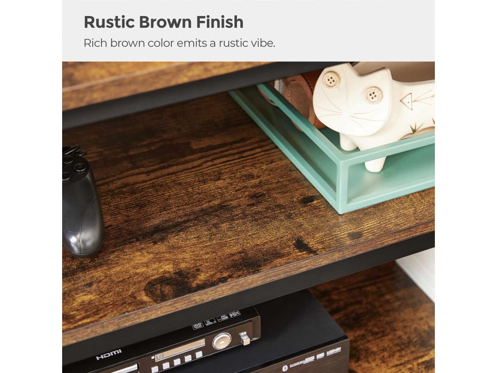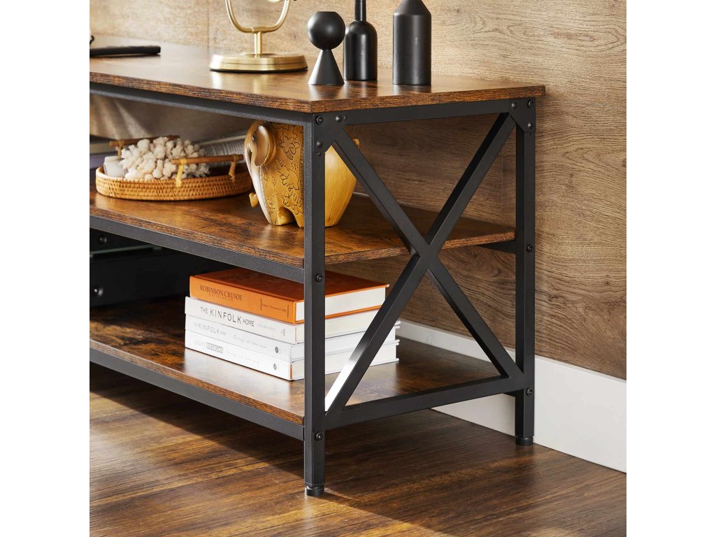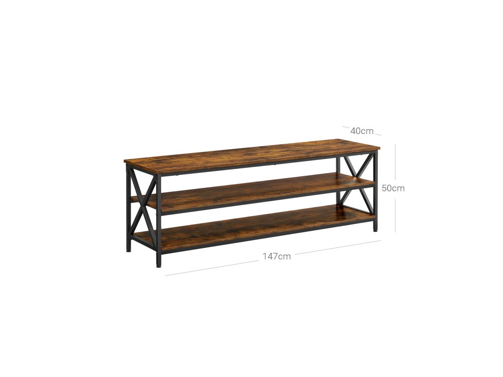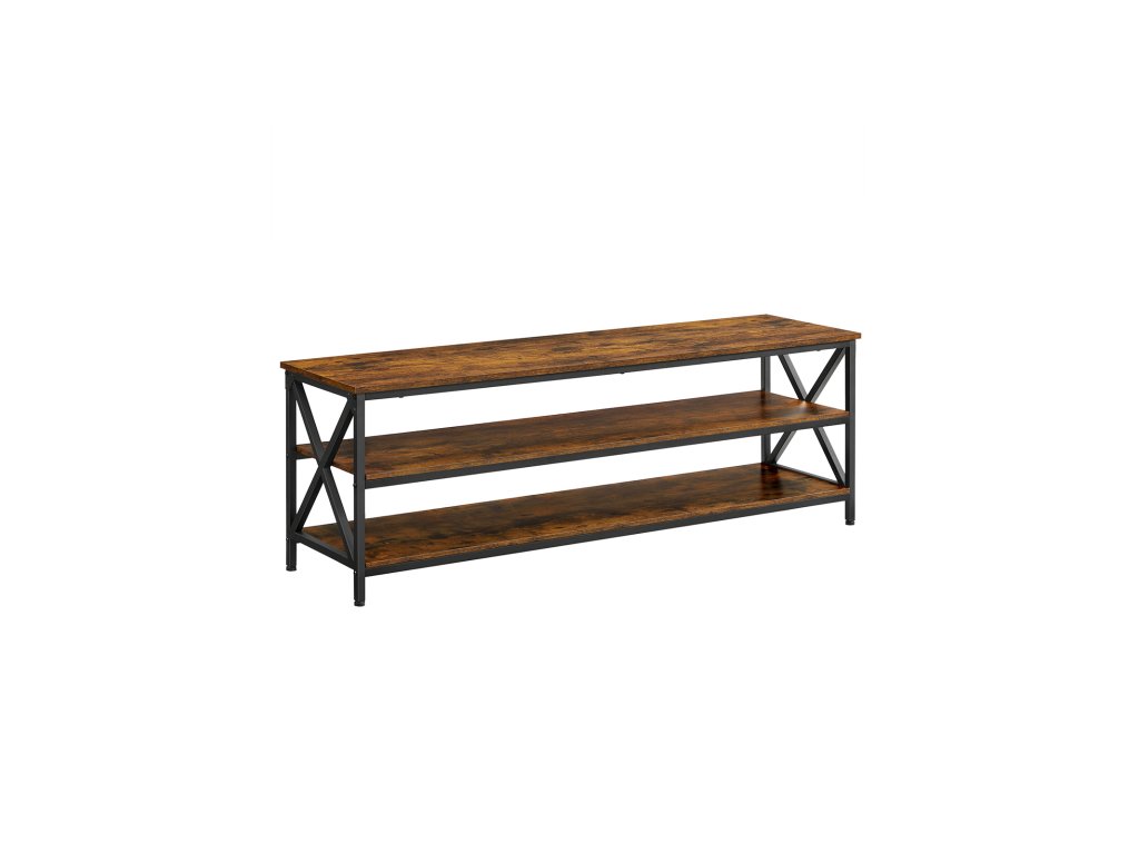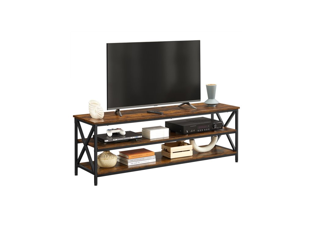 Televizní stolek, TV stolek, TV konzola pro až 65palcové televizory, s otevřenými úložnými policemi, ocelový rám ve tvaru X, farmářský průmyslový design, 147 x 40 x 50 cm, rustikální hnědá a černá.