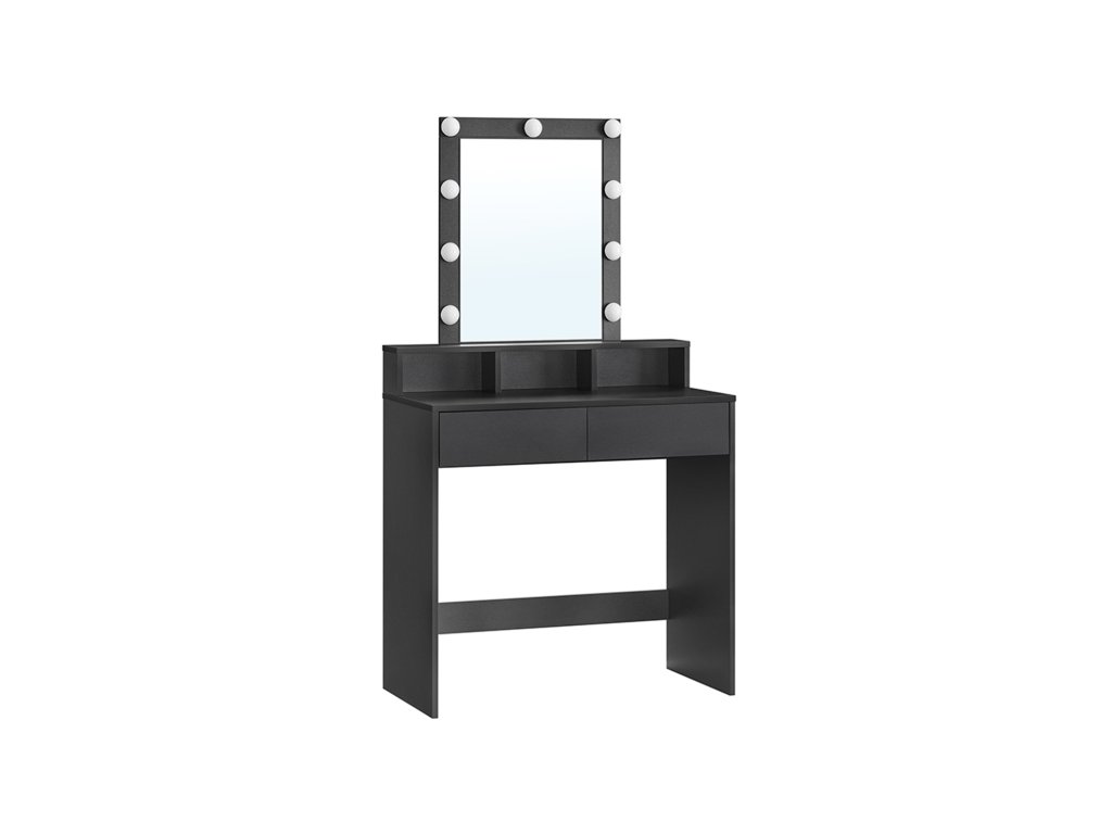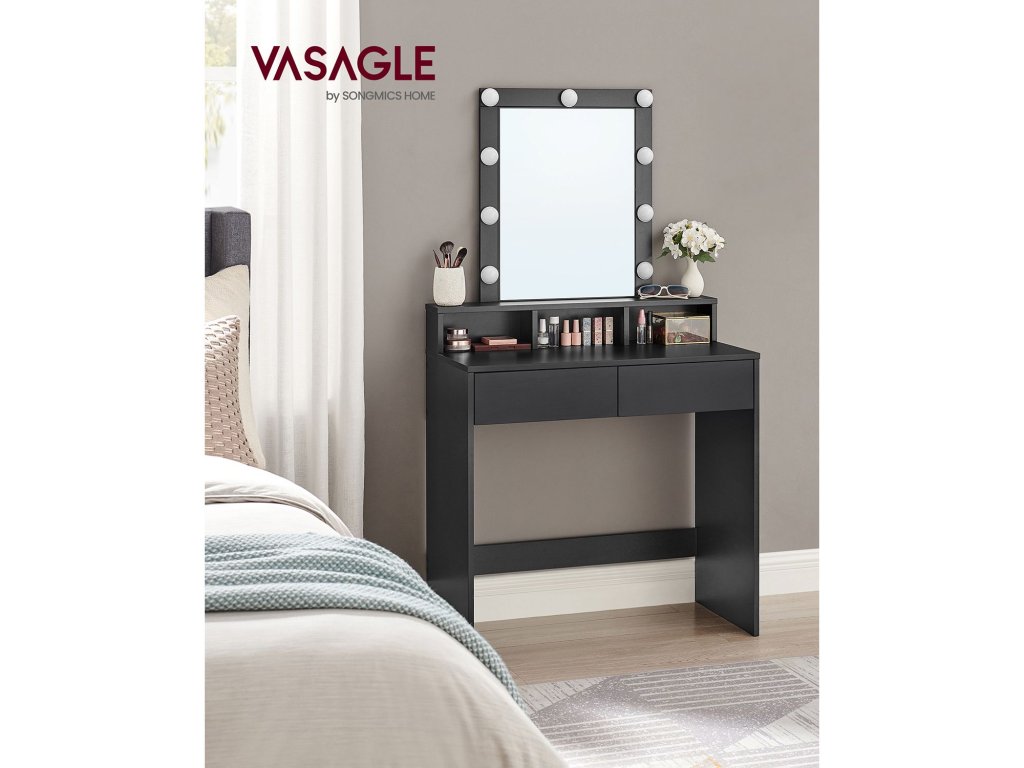 Toaletní stolek, LED osvětlení s nastavitelným jasem, kosmetický stolek se zrcadlem, 2 zásuvky a 3 přihrádky, moderní, černý.
