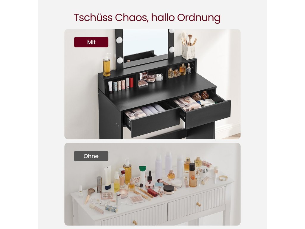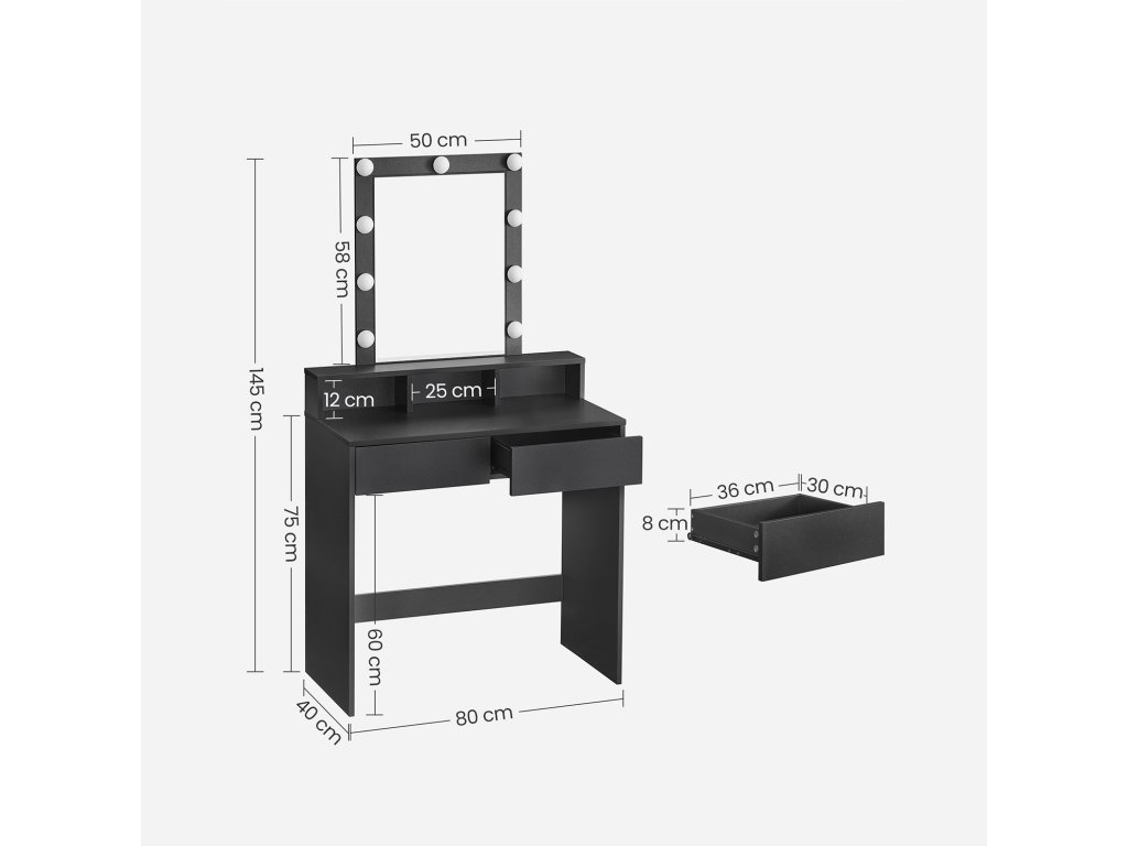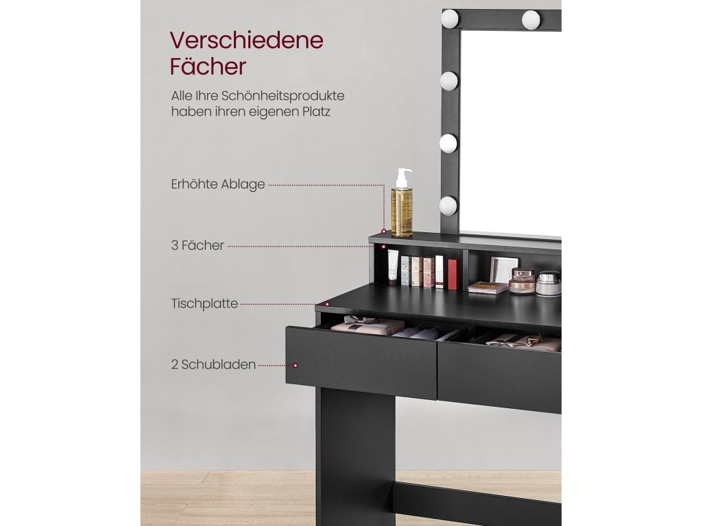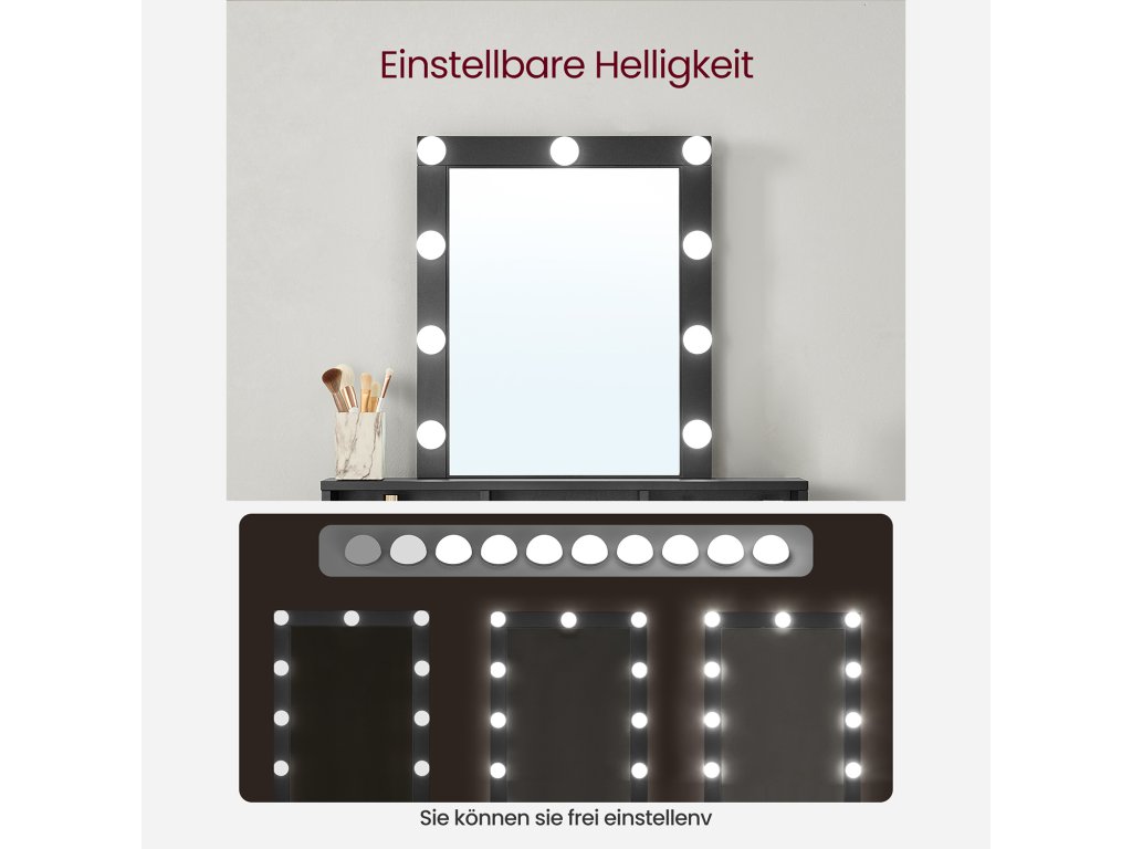 Nastavitelný jas světel Tento toaletní stolek je vybaven 9 světly s nastavitelným jasem. Dlouhým stisknutím přepínače můžete libovolně nastavit jas a najít to správné světlo pro dokonalé nalíčení. [Více prostorů] 1 vyvýšená polička na parfémy, 3 otevřené přihrádky na rtěnky, 2 prostorné zásuvky na fény a žehličky na vlasy a 1 velká deska. Tento toaletní stolek nabízí několik prostorů pro uložení kosmetických potřeb. [Skryté světelné kabely] Světelné kabely jsou skryté za zrcadlem, nikoliv odkryté, aby vypadaly atraktivněji. [Upevňovací zařízení pro větší bezpečnost] Připevněte kosmetický stolek ke stěně pomocí přiloženého upevňovacího zařízení a vytvořte bezpečnější prostředí. [Robustní a snadno se čistí] Tento toaletní stolek je vyroben z kvalitní dřevotřísky a je pevný a odolný. Její povrch je odolný proti opotřebení a snadno se čistí, takže ji můžete používat dlouho.| Kategorie: | Toaletní stolky |