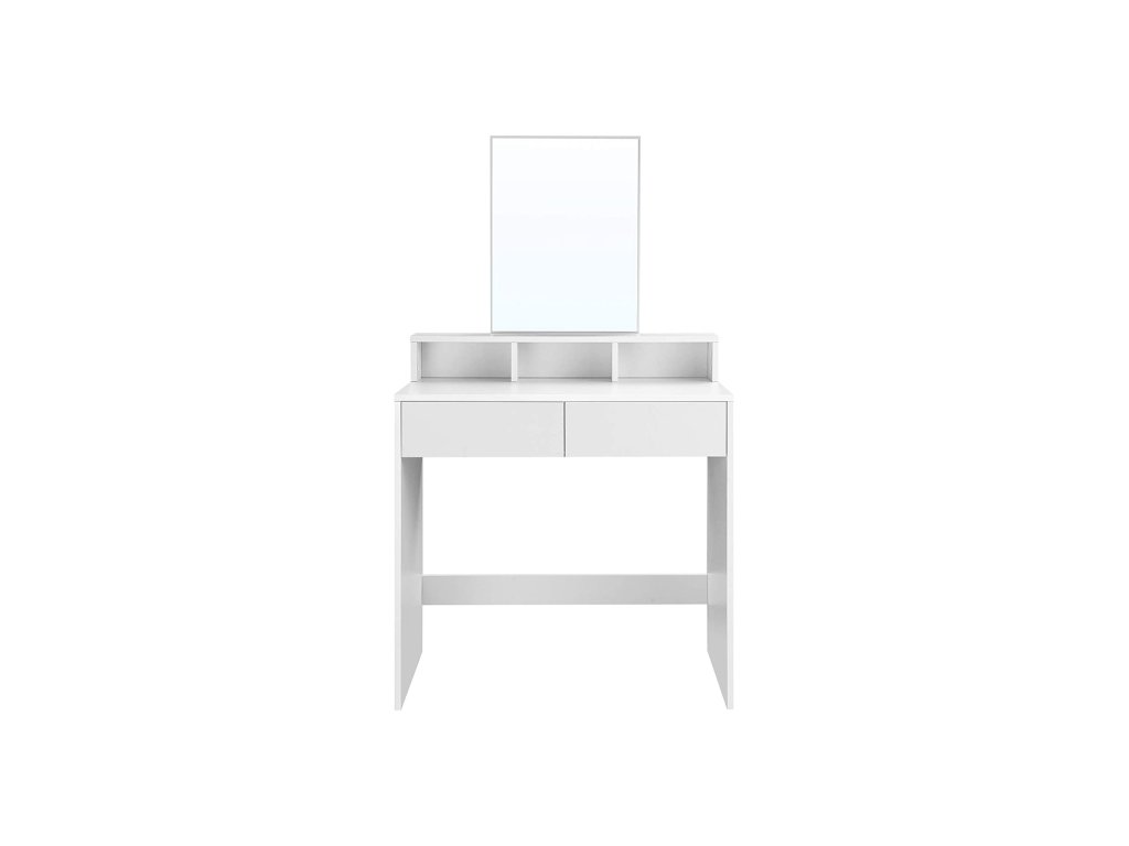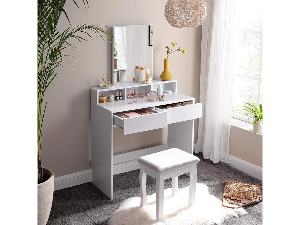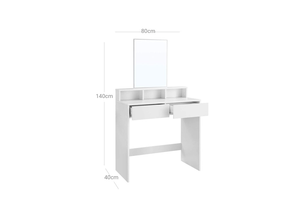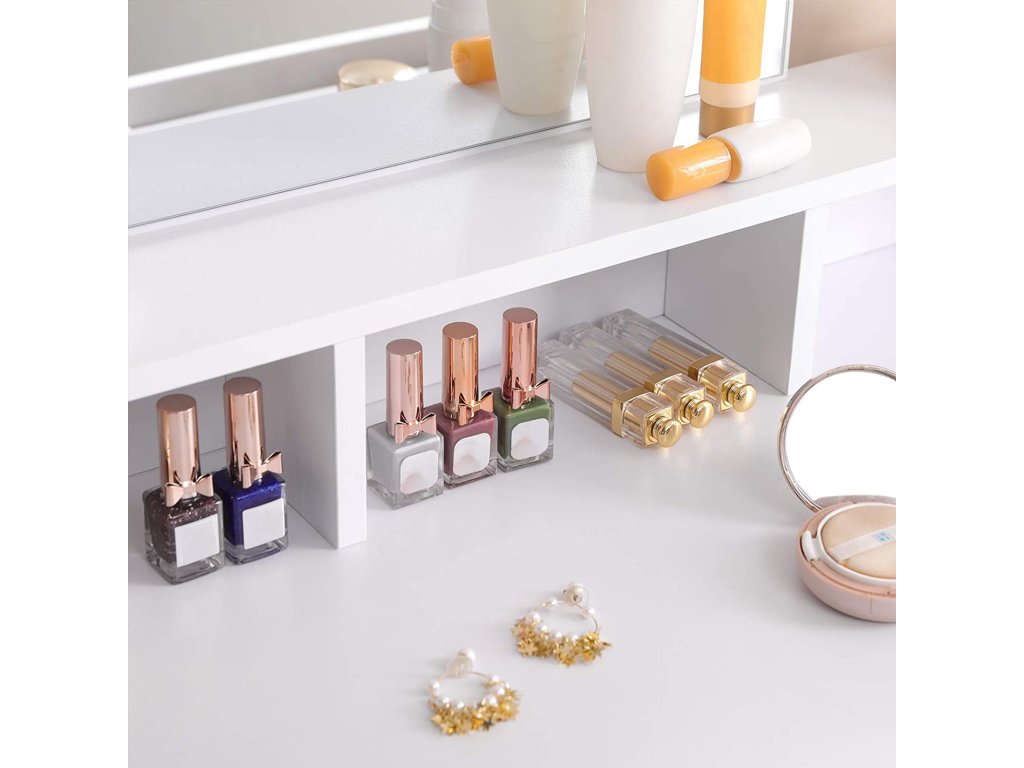 VŠECHNY UŽ JSOU TADY: Už vás nebaví každý den shánět kosmetiku? Minulost. Oční stíny a pudry jsou již ve 2 velkých zásuvkách, laky na nehty jsou dobře chráněny ve 3 otevřených přihrádkách. a parfémy vystavené na vyvýšeném pódiuZAČNĚTE DEN SKVĚLE! Moderní design, obdélníkové zrcadlo a zářivý vzhled vám vykouzlí úsměv na tváři, jakmile se posadíte před tento kosmetický stolek; se zde budete chtít pokaždé připravit znovu!;