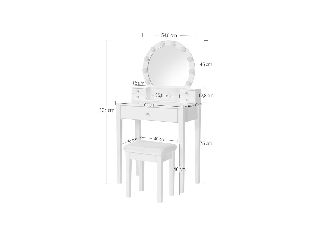 Toaletní stolek se zrcadlem, 10 stmívatelných žárovek, moderní, polstrovaná stolička, 5 zásuvek, 70 x 40 x 134 cm, ideální dárek, bílý.