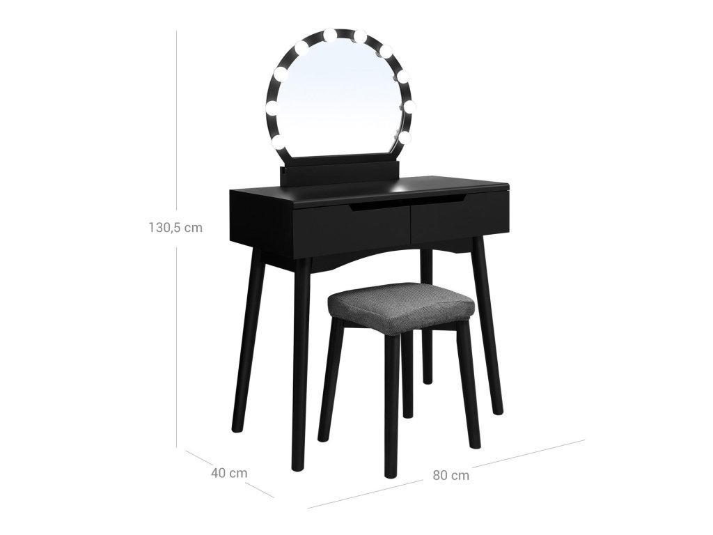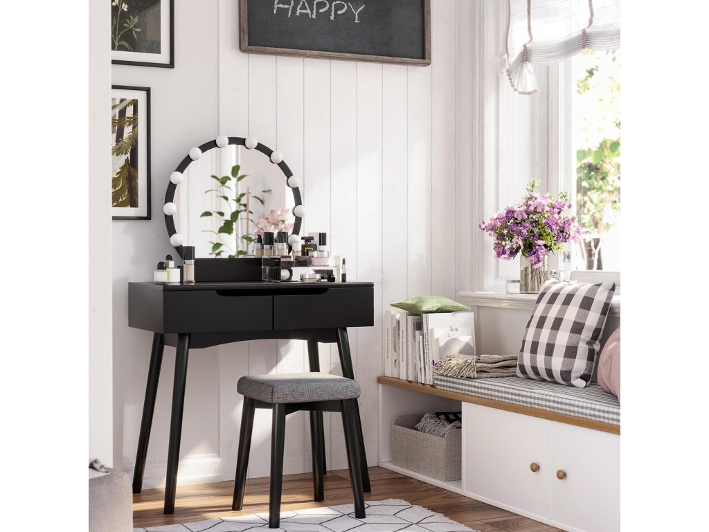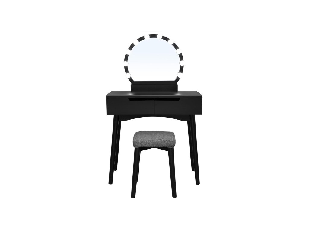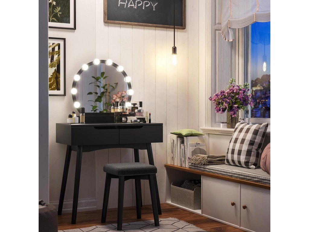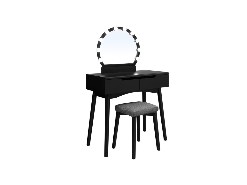 Toaletní stolek se zrcadlem a žárovkami na líčení, toaletní stolek se 2 velkými posuvnými zásuvkami a polstrovanou stoličkou, černý.