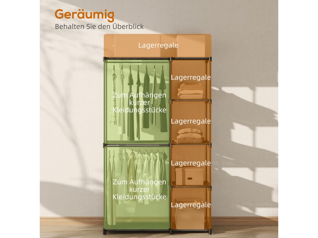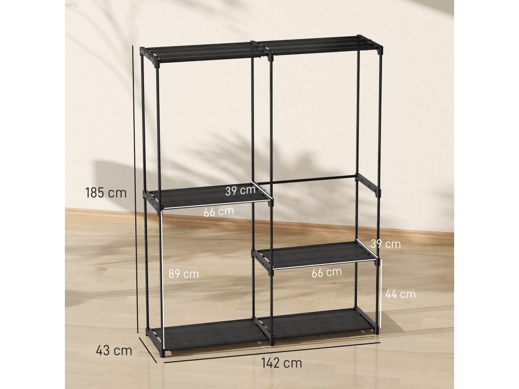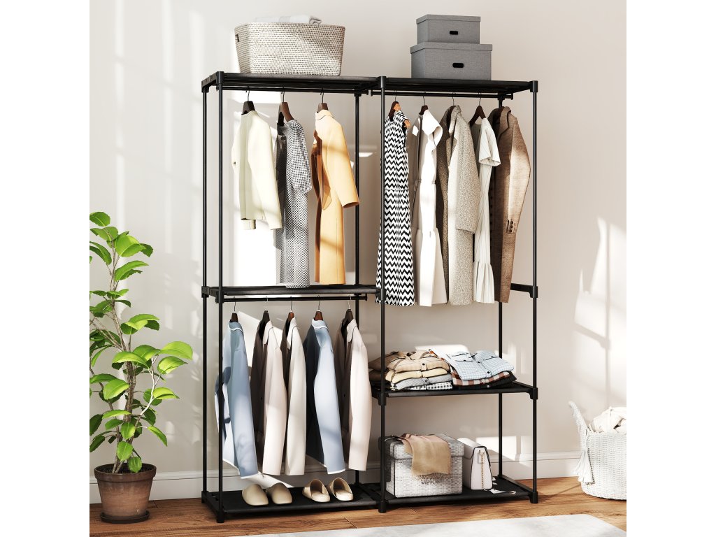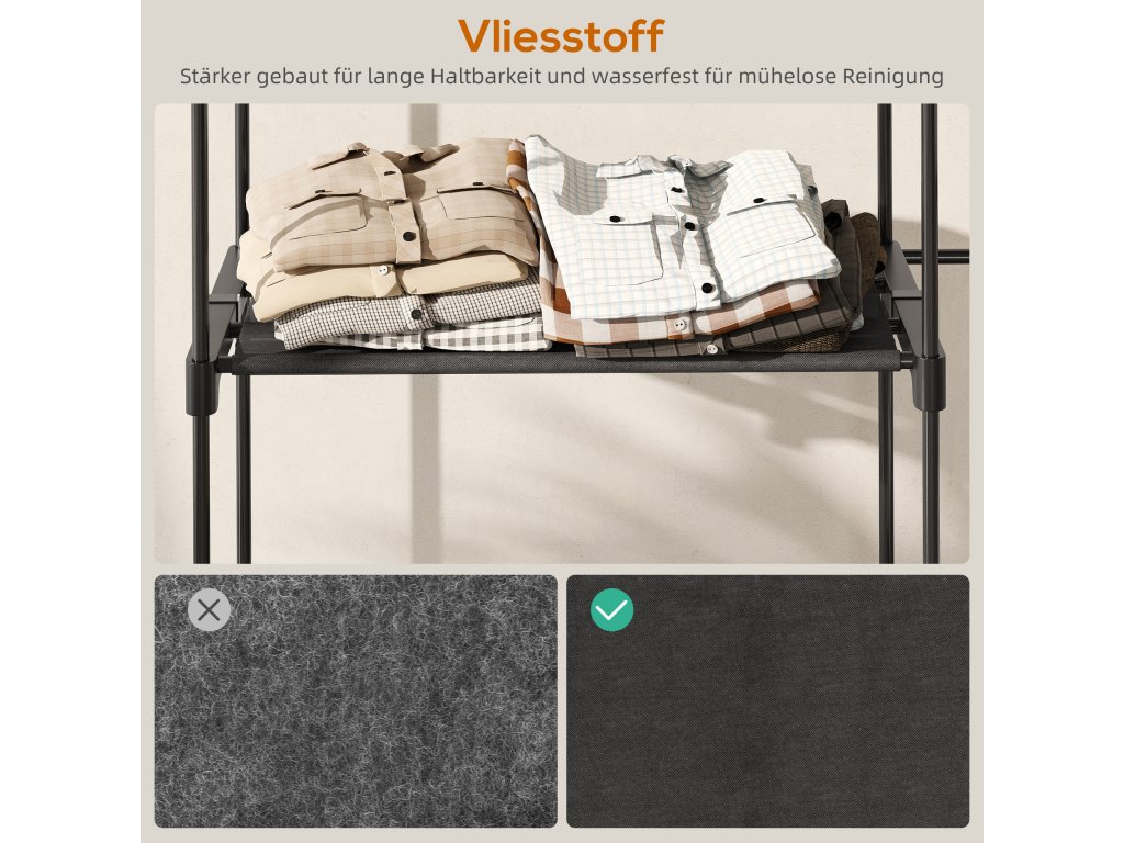 ✔ Tato látková šatní skříň má čtyři police a tři závěsné tyče, takže si snadno uspořádáte veškeré oblečení.