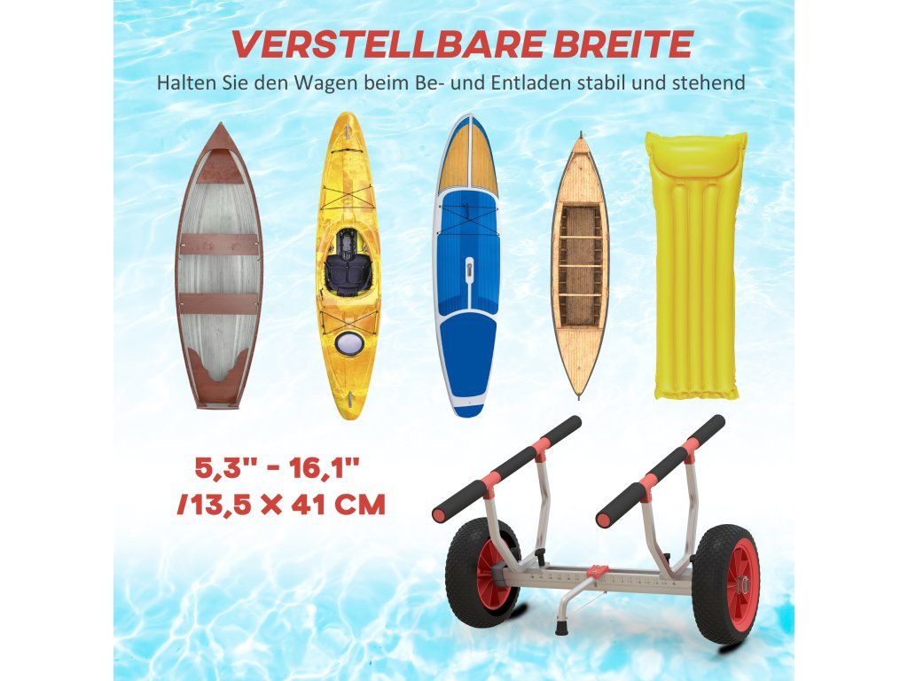 Nastavitelná šířka: Rám vozíku na SUP lze nastavit. Šířka je nastavitelná (13,5 - 41 cm), aby se na něj vešly kajaky, kánoe nebo jiné typy lodí a zabránilo se tak sklápění.