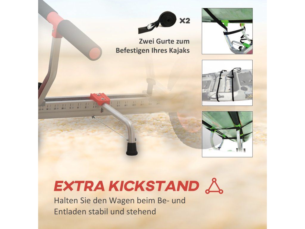 Stabilní stojan: Stojan umožňuje bezpečně zaparkovat kajakový vozík a zajistit ho na místě během nakládání a vykládání. Součástí balení jsou dva popruhy pro zajištění lodi.