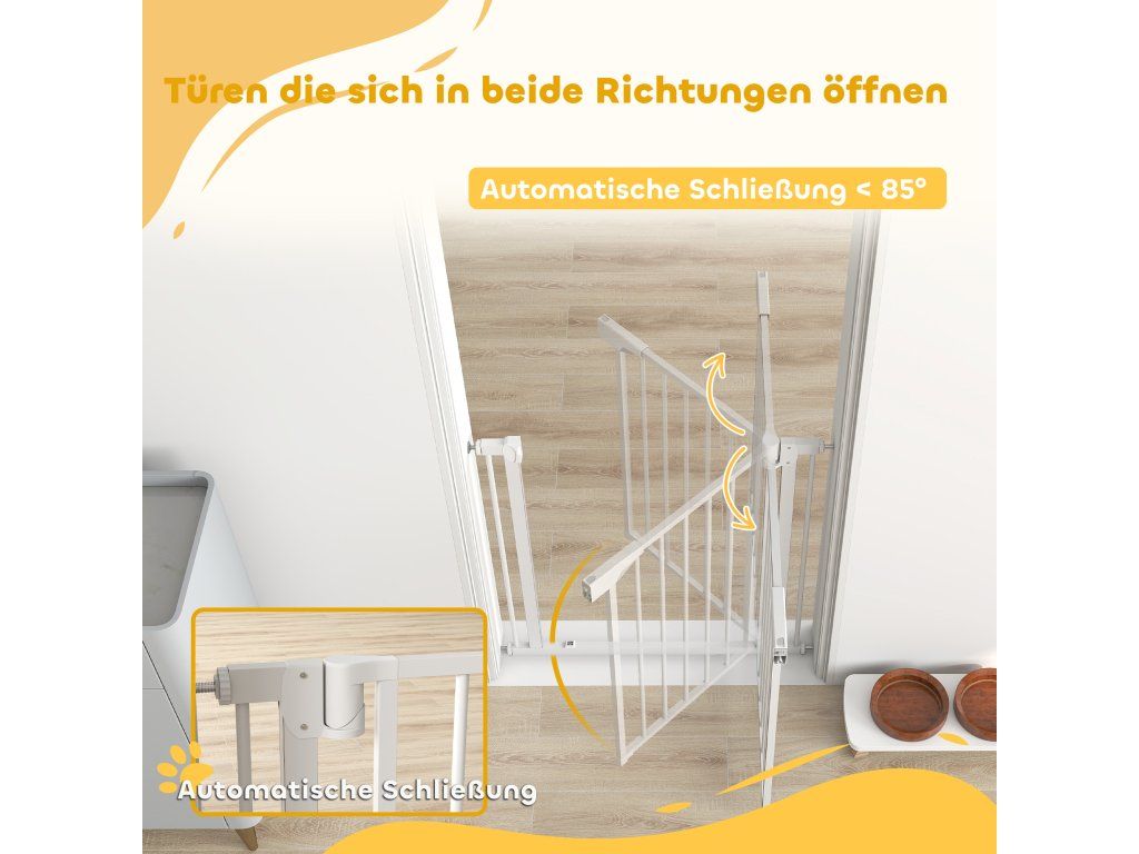 Snadné ovládání jednou rukou: Schodišťová branka se otevírá v obou směrech, poskytuje otvor 52 cm a automaticky se zavírá v úhlu 85°, což zajišťuje bezpečnost dětí a domácích mazlíčků, i když jsou nechtěně ponecháni otevření.