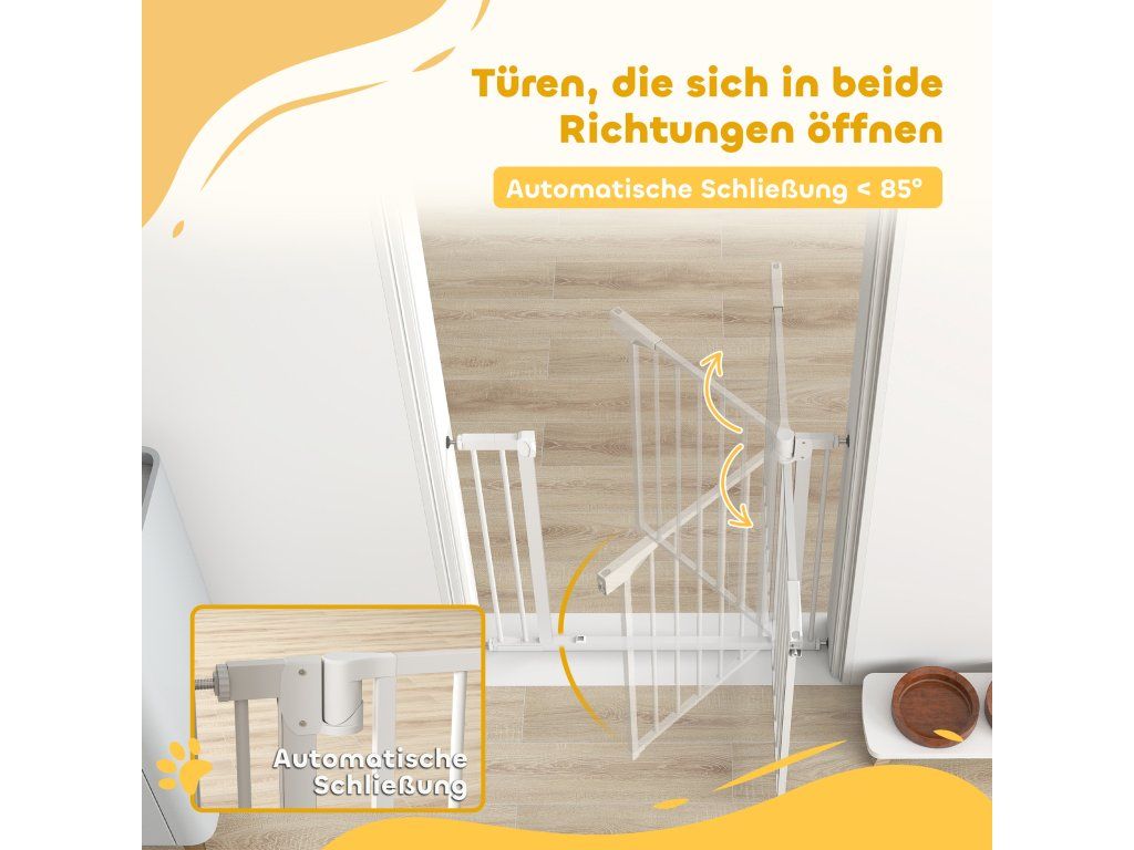 Snadné ovládání jednou rukou: Schodišťová branka se otevírá v obou směrech, poskytuje otvor 52 cm a automaticky se zavírá v úhlu 85°, což zajišťuje bezpečnost dětí a domácích mazlíčků, i když jsou nechtěně ponecháni otevření.