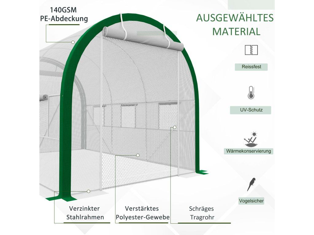 Vysoce kvalitní fóliový kryt: Naše dvouvrstvá fólie s gramáží 140 GSM má uprostřed síťovinou pro odolnost proti roztržení. Chrání rostliny před nadměrným UV zářením a zároveň propouští 85 % slunečního světla. Polyesterové výztuhy ve švech poskytují větší stabilitu a styl.