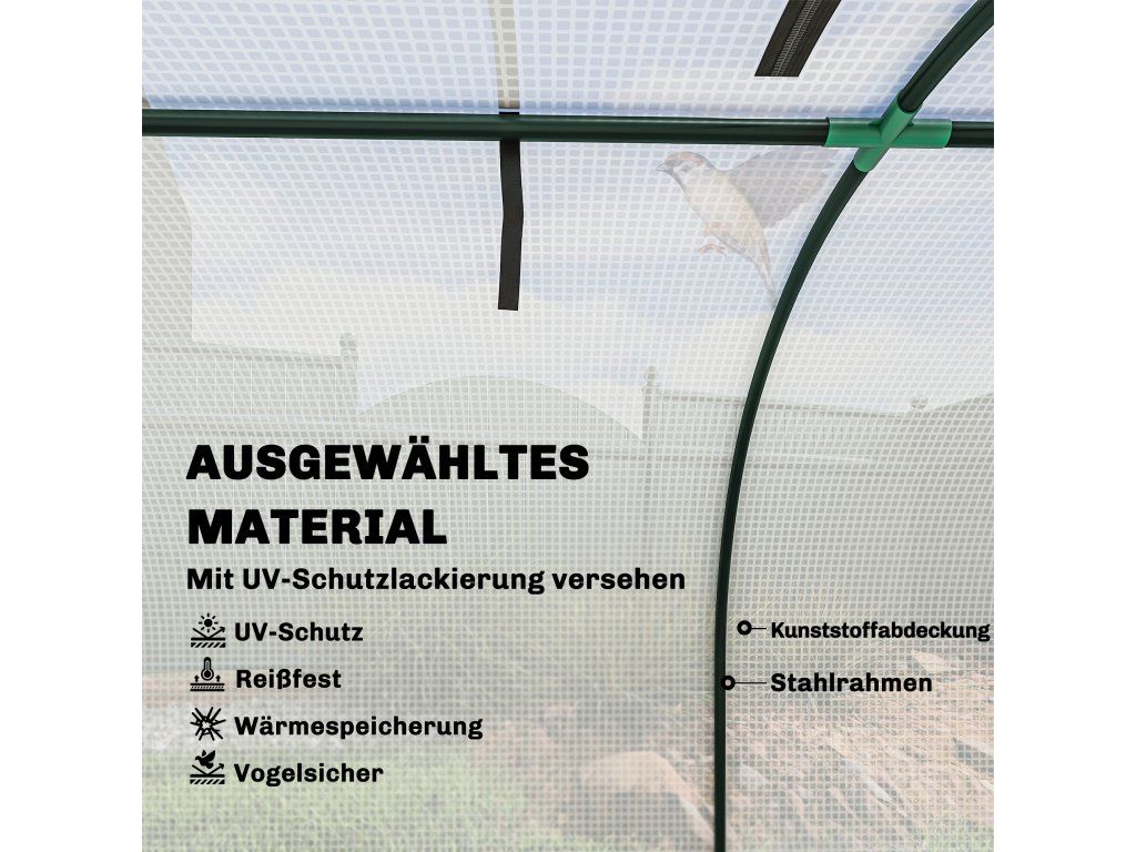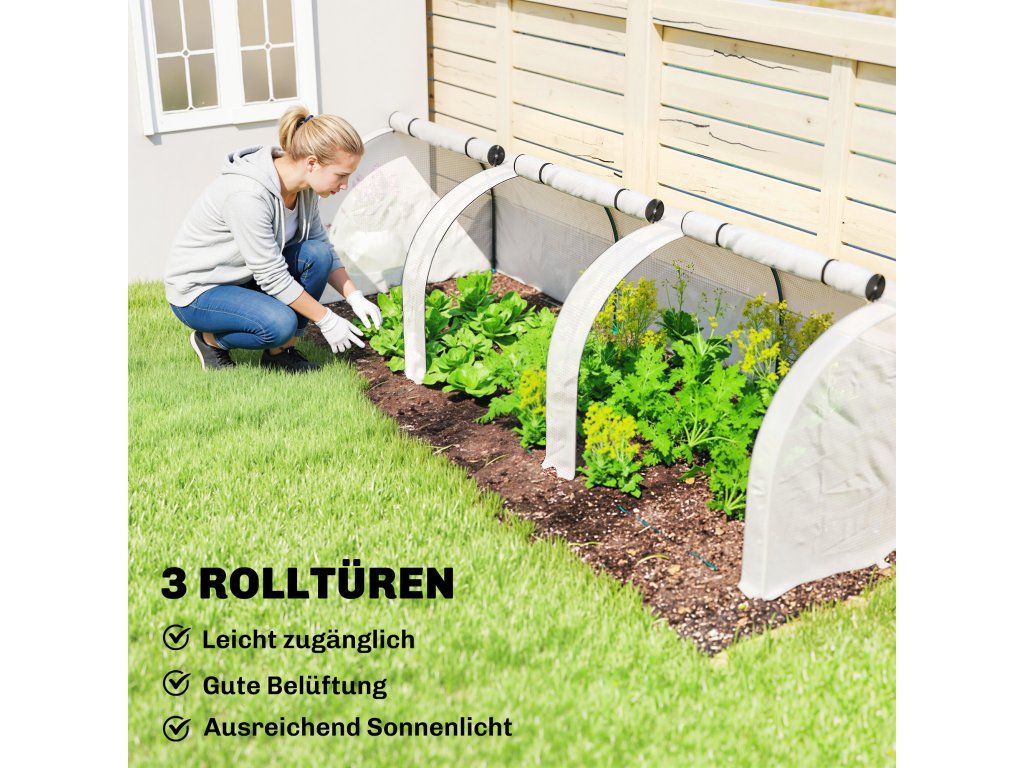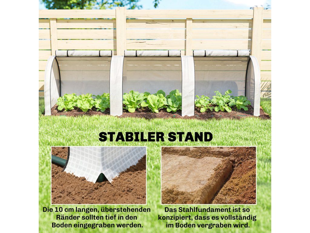 Robustní a odolná konstrukce: Pevný ocelový rám s práškovým nástřikem je pokryt průhlednou plastovou fólií, která chrání vaše rostliny před chladem. Kryt skleníku má přečnívající okraj, který lze zahloubit do země pro zvýšení stability a udržení krytu pevně uzavřeného.