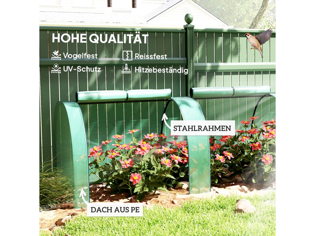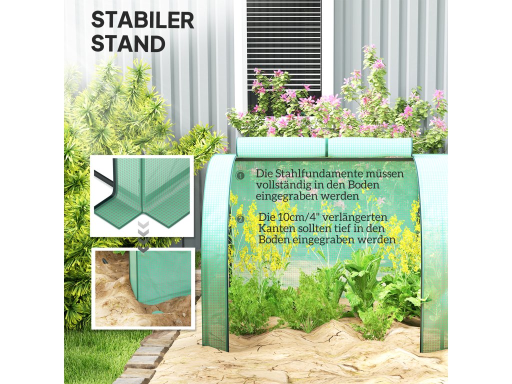Robustní a odolná konstrukce: Pevný ocelový rám s práškovým nástřikem je pokryt průhlednou plastovou fólií, která chrání vaše rostliny před chladem. Kryt skleníku má přečnívající okraj, který lze zahloubit do země pro zvýšení stability a udržení krytu pevně uzavřeného.