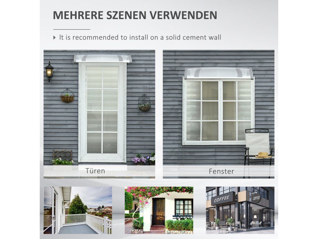 Snadná montáž: Naše stříška na vstupní dveře je dodávána se vším potřebným příslušenstvím a návodem k instalaci na různé druhy stěn, včetně betonových nebo cihelných. Pro větší pokrytí lze spojit více identických stříšek. Pro rychlejší montáž se doporučují dvě osoby.