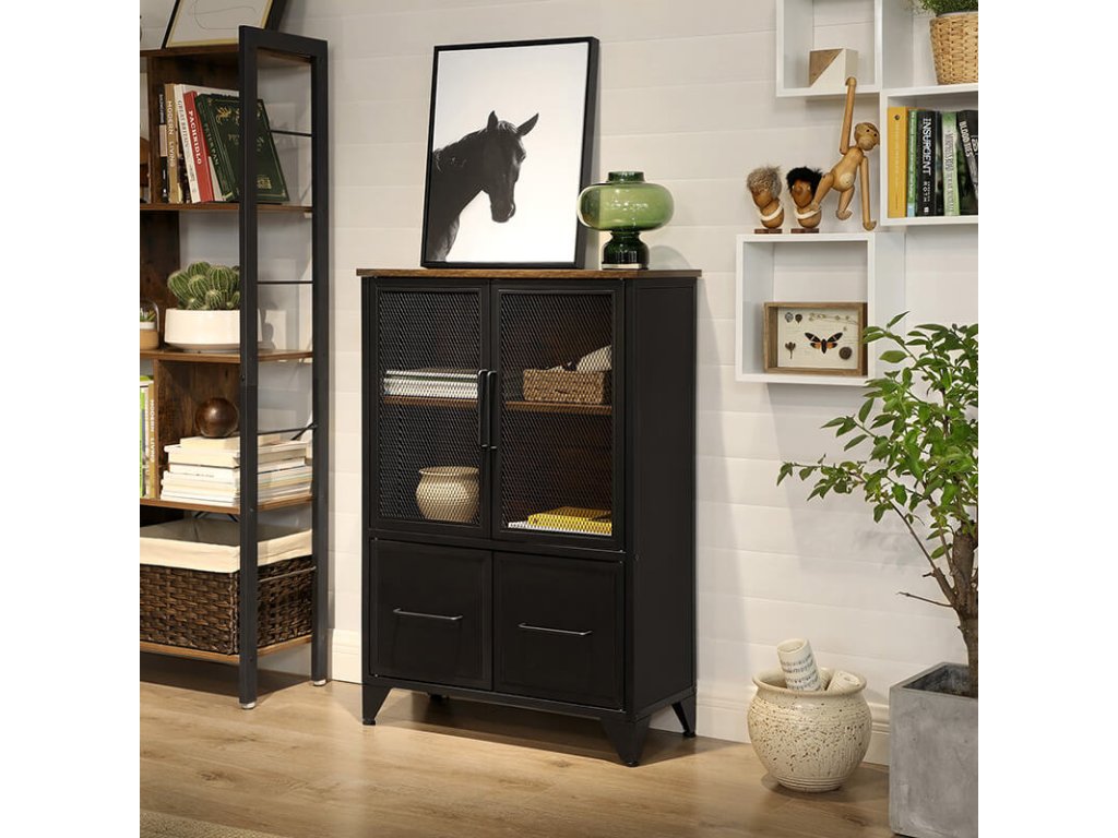 Na desku stolu můžete umístit krásné vázy a rámy na obrazy a na dvě úložné police pod ním můžete uložit knihy a řemeslné výrobky. Vaše sbírka uvnitř skříně bude zčásti skrytá a zčásti viditelná za dvířky z kovové síťoviny v matné černé barvě, takže budou vypadat atraktivněji.