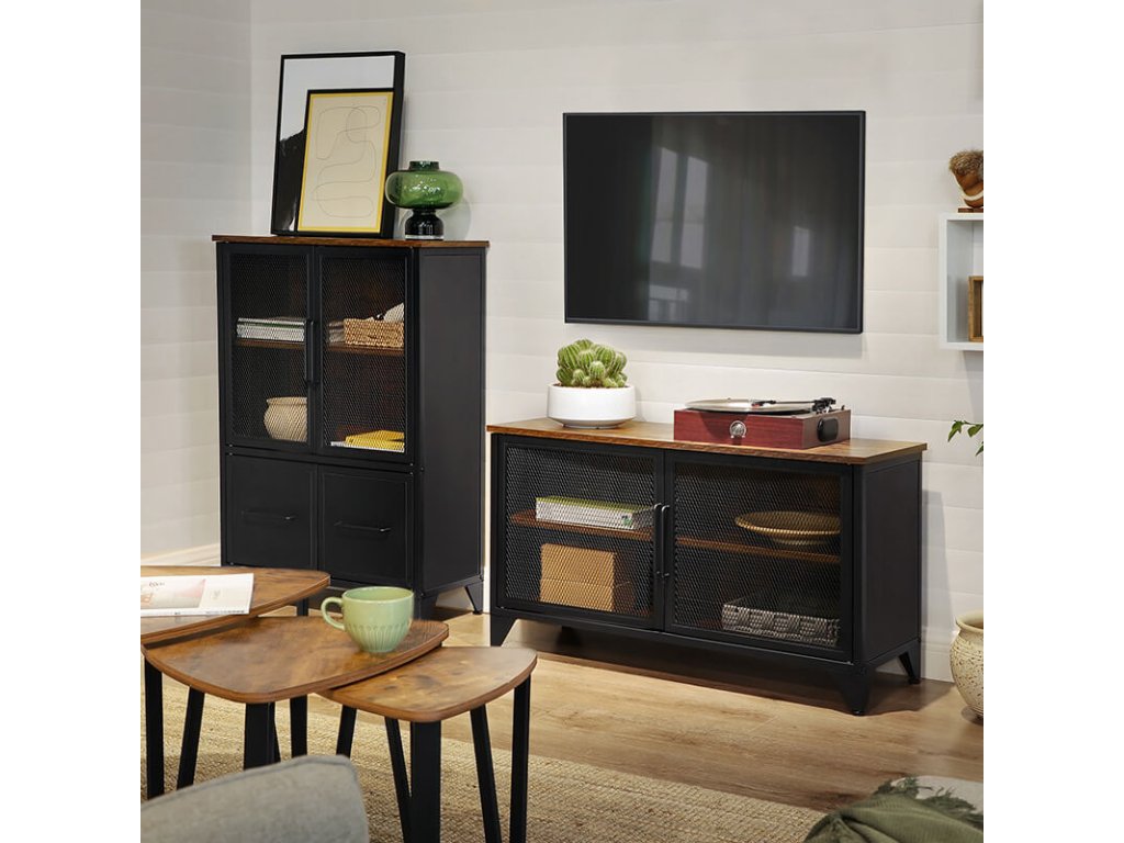 Teplé rustikální tóny hnědého dřeva, černý ocelový rám, dvířka z husté síťoviny a kuželovité nožky - tyto akcenty se snoubí na této úložné skříni. je to elegantní industriální kousek, který se ve vaší domácnosti stane výrazným.