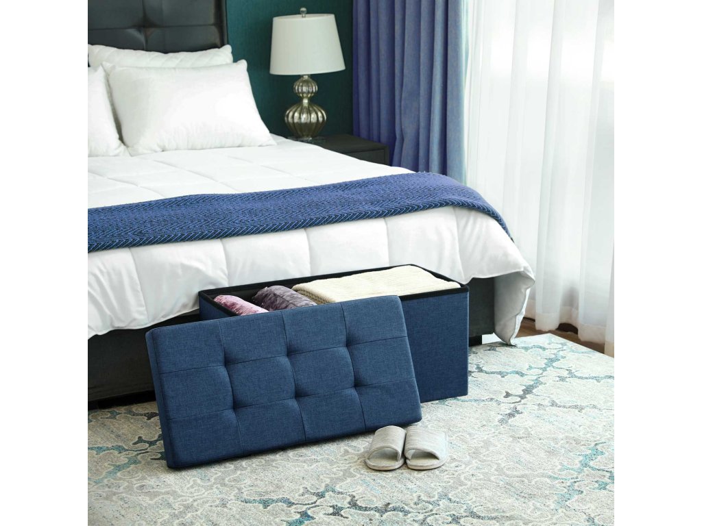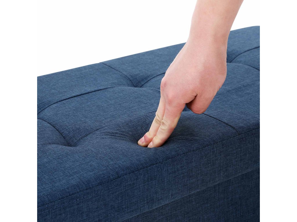 Poutavý úložný prostor: Moderní tmavě modrá barva a chomáčky ve stylu Chesterfield na pohodlně čalouněném sedáku dělají z této lavice atrakci v každé místnosti. a přitom má působivou funkčnost a vysokou statickou nosnost 300 kg.NA KONCI POSTELE? Kam byste chtěli umístit tento úložný otoman? Zda do obývacího pokoje naproti pohovce nebo do předsíně vedle šatní skříně. jediným omezením vaší vynalézavosti je vaše představivost!