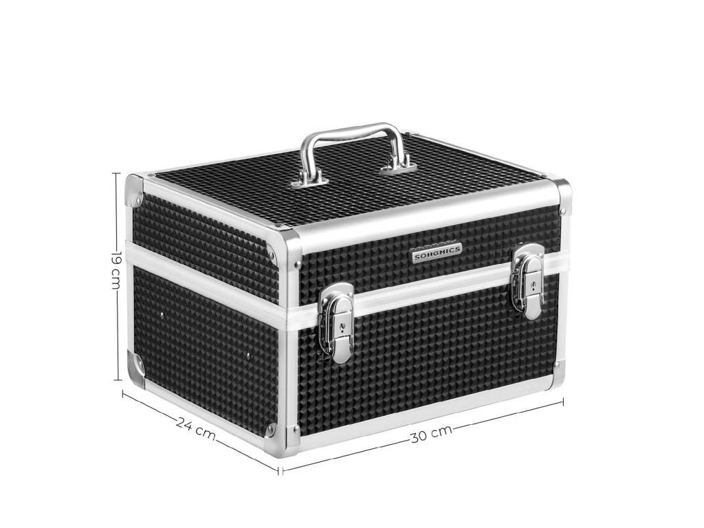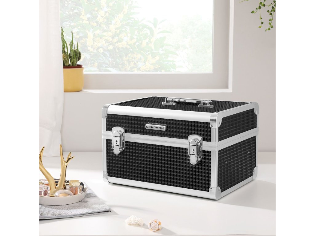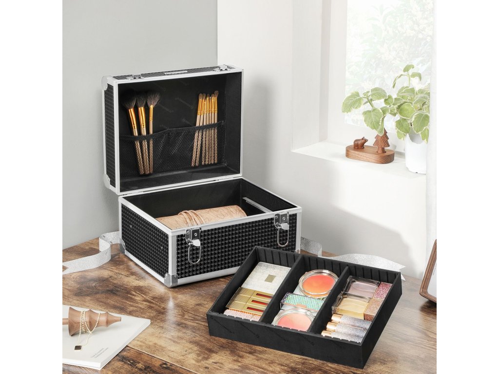 VÁŠ SOUKROMÝ VIZÁŽISTA: Hledáte řešení, které by bylo možné vzít s sebou a uložit make-up? Proč nevyzkoušet toto pouzdro na líčidla? Díky své nízké hmotnosti a připevněnému držadlu můžete si ji snadno vzít s sebou a mít na cestách vždy svůj lesk.ÚŽASNÝ VZHLED ZVENČÍ, VELKORYSÝ ÚLOŽNÝ PROSTOR UVNITŘ: Zvenku se černý povrch se stříbrným okrajem vzájemně doplňují a vytvářejí okouzlující vzhled; Uvnitř jsou 2 vrstvy, do kterých se vejdou oční stíny, tvářenky, laky na nehty a další;KEEP SAFE, KEEP CALM: Zámky se dvěma klíči ochrání vaši kosmetiku před nepovolanými rukama nebo zlobivými dětmi a poskytují pocit bezpečí pro vás i vaše líčení, zejména na cestách.POKUD NEPŘÍLIŠ ČASTO CESTUJETE... Stačí ji postavit na toaletní stolek a nechat ji sloužit vaší každodenní rutině. takže můžete strávit méně času hledáním kosmetiky a více času nanášením bezchybného make-upu.