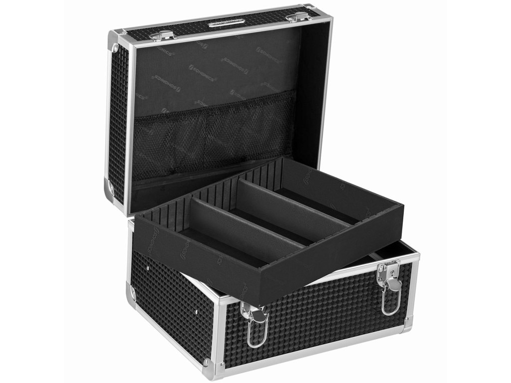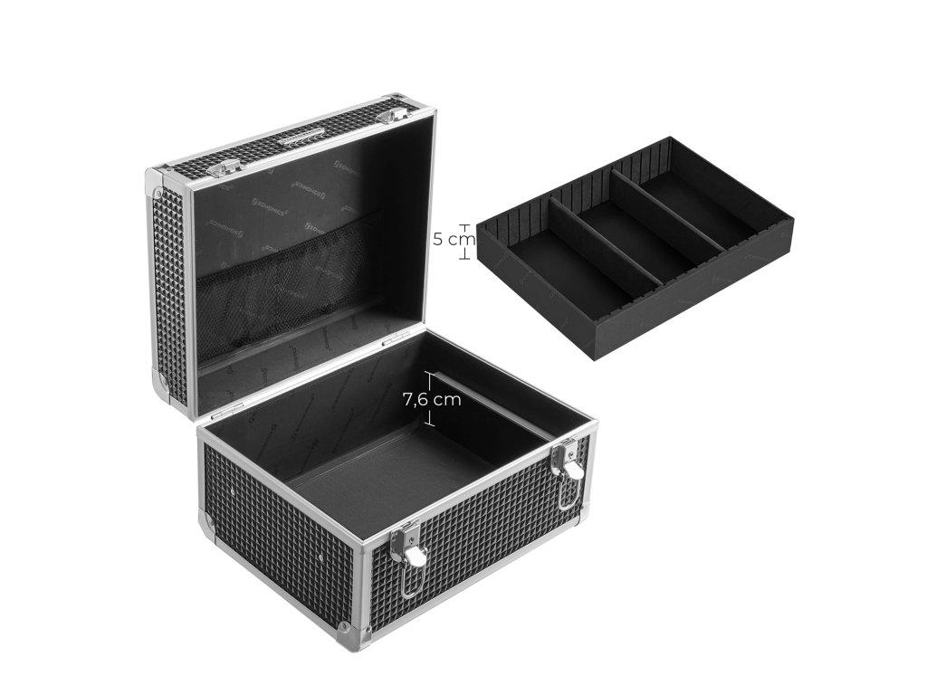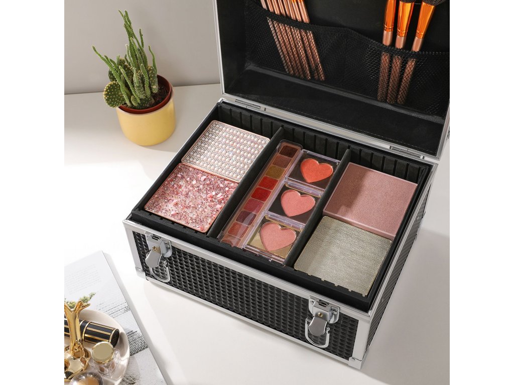 Uzamykatelný kosmetický kufřík, cestovní kosmetický organizér pro kadeřníky a vizážisty, s odnímatelným zásobníkem, černý.