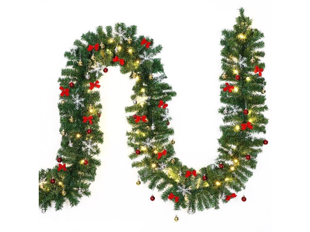 Girlanda je ozdobená vločkami, kouličkami a červenými mašličkami. Girlandu lze rovněž pověsit venku, takže ji můžete použít k ozdobení vaší zahrady. Dekorace pracuje na principu úsporné LED technologie, a má tudíž velmi nízkou spotřebu. Po Vánocích ji stačí složit a uklidit a příští rok se z ní můžete těšit znovu.
