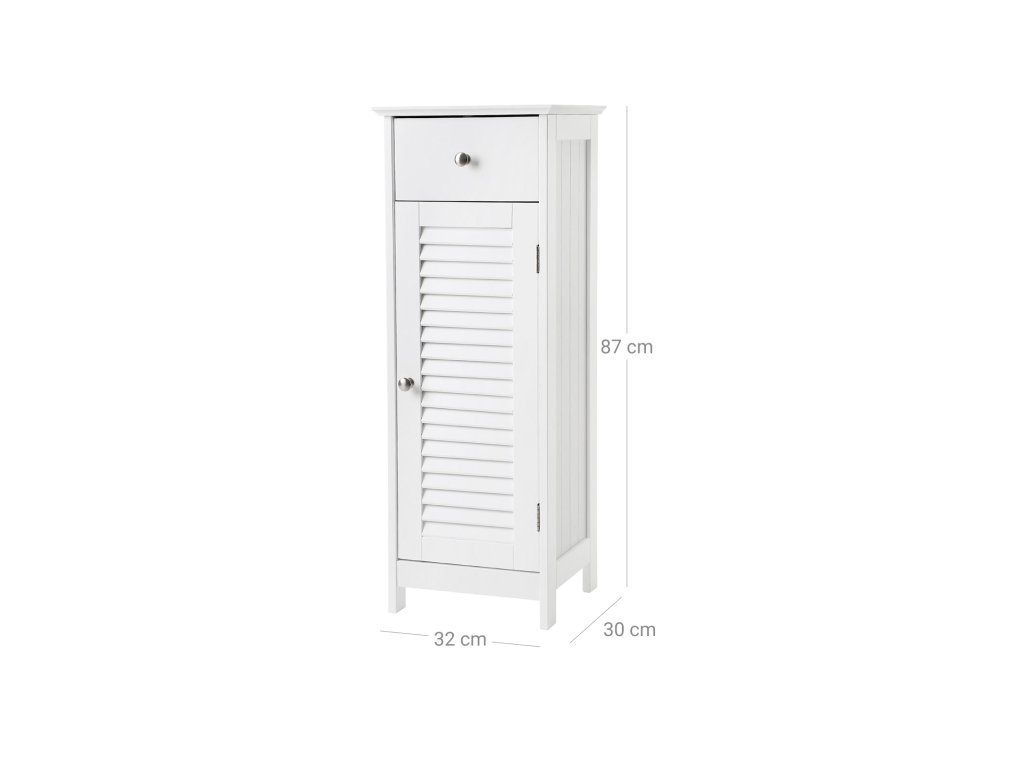 Noční skříňka, úložný prostor do koupelny, dřevěná se zásuvkou, lamelové dveře, bílá, dřevěná konstrukce, 32 x 30 x 87 cm.