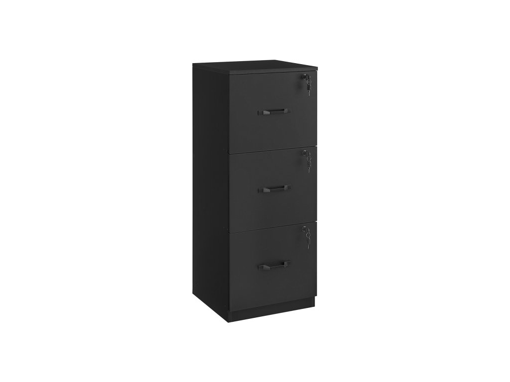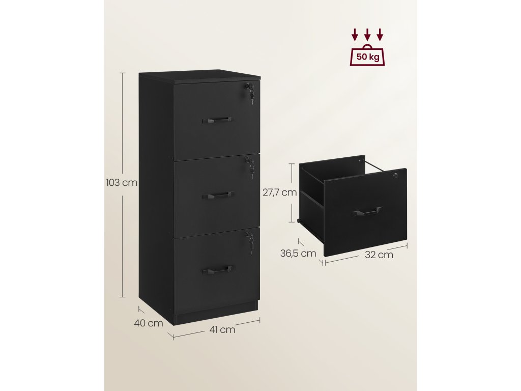Velké úložiště Malá plocha Tato skříňka na dokumenty o rozměrech 15,7" D x 16,1" Š x 40,6" V je vybavena 3 zásuvkami, které nabízejí spoustu úložného prostoru, aby vaše dokumenty byly uspořádané a snadno přístupné, a přitom nezabíraly mnoho místa na podlaze.Vhodné pro pořadače formátu A4 a Letter V každé ze 3 zásuvek na pořadače můžete nastavit polohu závěsné lišty a zavěsit tak pořadače formátu A4 nebo Letter ve vodorovné poloze pro snadný přístup.Bezpečné soubory, bezpečný domov Všechny 3 zásuvky lze uzamknout samostatně, aby byly vaše různé důležité dokumenty v bezpečí. Součástí dodávky je sada proti překlopení, díky které můžete vertikální kartotéku připevnit ke stěně a zajistit tak větší bezpečnost.Dodejte svému prostoru teplo Díky panelům z inkoustově černé dřevotřísky je tato vertikální kartotéka kusem teplého nábytku, který zútulní vaši domácí kancelář a učiní ji přívětivější.Snadná montáž Díky jasně označeným dílům a ilustrovaným návodům je montáž této uzamykatelné skříně hračkou. Skvěle se hodí jako stojan na tiskárnu v domácí kanceláři nebo pracovně.| Kategorie: | Kancelářské skříně |