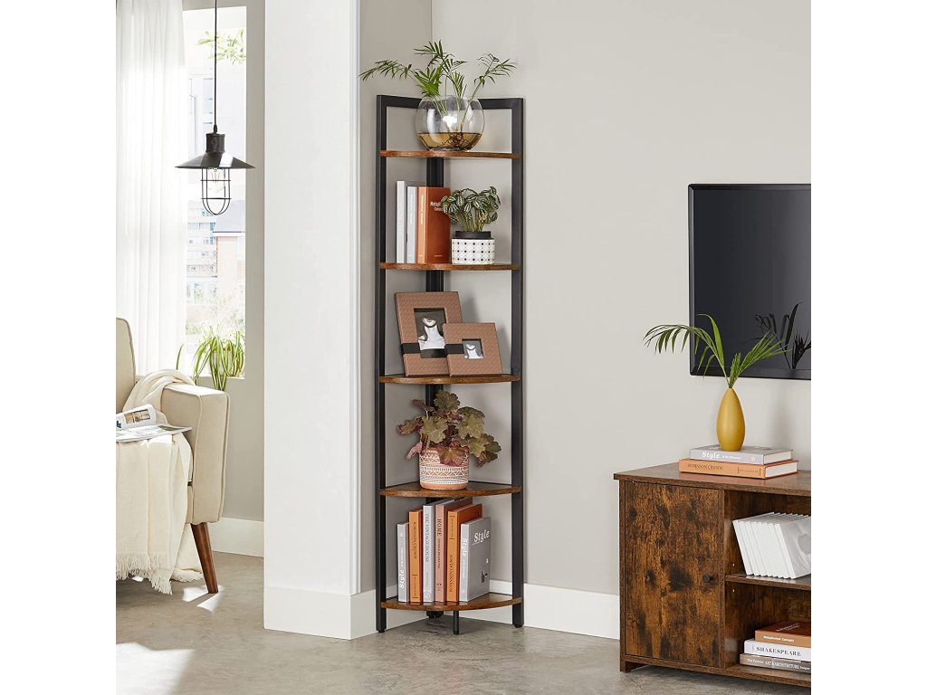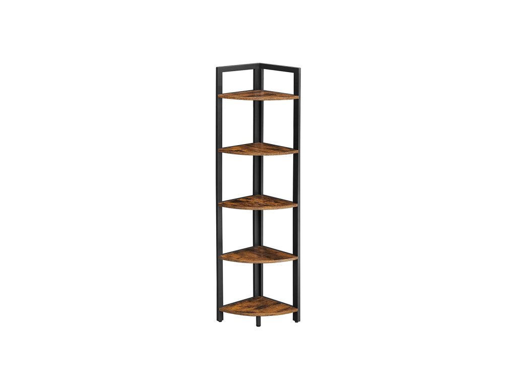 5-patrový rohový regál, víceúčelový úložný regál, stojan na rostliny, 30 x 30 x 150 cm, průmyslový, do obývacího pokoje, ložnice, domácí kanceláře, rustikální hnědá a černá.