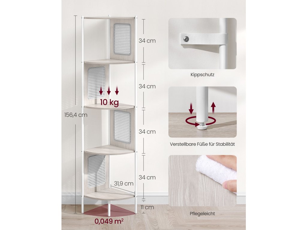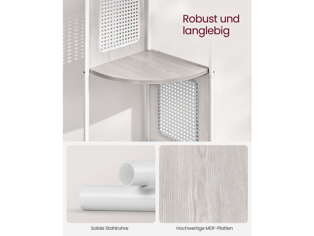 JEDNODUCHÉ A PŘÍRODNÍ Jednoduché ocelové trubky se setkávají s ratanovým vzhledem - tato jednoduchá rohová police dodá vašemu domovu přirozený a útulný nádech a vnese svěžest do každého rohu.Prostorná a úsporná Knihovna o rozměrech 12,5 x 12,5 x 61,4 palce nabízí 5 polic na knihy, rámy obrazů, rostliny a dekorativní prvky. Díky svému tvaru se perfektně hodí do každého rohu a šetří místo.Univerzální Ať už chcete zvýraznit své oblíbené kousky v obývacím pokoji, vytvořit oázu pro čtení v pracovně, zkrášlit zákoutí ložnice nebo vnést více pořádku do kuchyně. rohový regál splňuje všechny vaše potřebyOdolnost Vysoce kvalitní panely MDF v kombinaci s odolnou ocelí vytvářejí pevnou a odolnou stojící polici. Díky nosnosti až 10 kg na úroveň můžete bez obav vystavovat své oblíbené kousky.Snadno se sestavuje a čistí: Díky označeným dílům a jasnému návodu (čeština není zaručena) je montáž hračka. Panely z MDF se snadno čistí, takže vaše police bude vždy vypadat dokonale.| Kategorie: | Knihovny |
