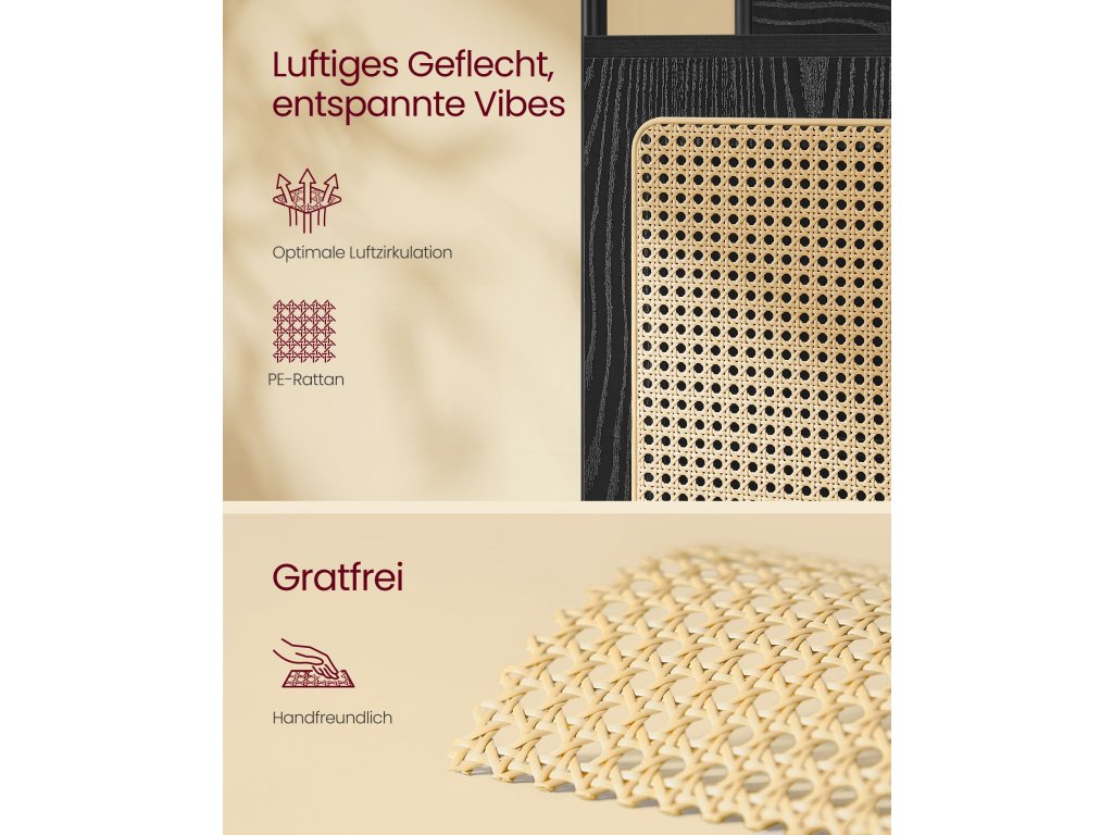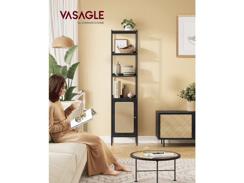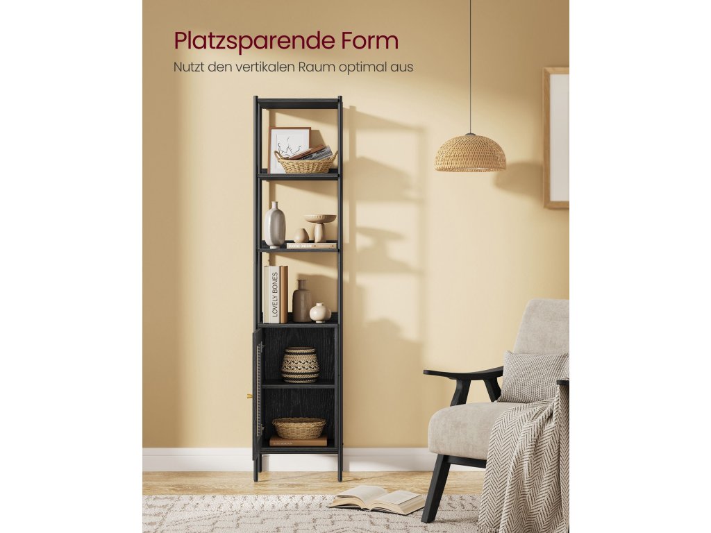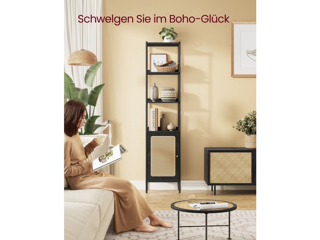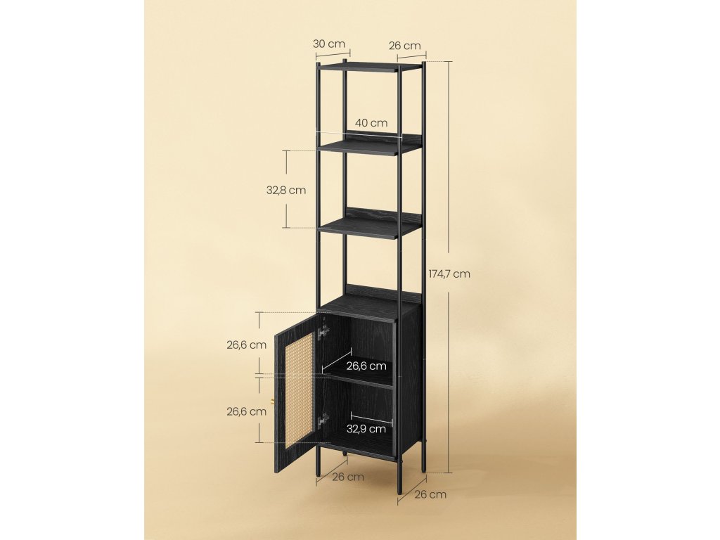 Bursting with Boho Charm S touto knihovnou vnesete do svého prostoru bohémskou atmosféru. Její uklidňující černá paleta v kombinaci s dvířky skříněk připomínajícími ratan působí vzdušně a uvolněně, což povznese jakýkoli moderní prostor nebo doplní boho dekor.Maximální využití vertikálního prostoru Tento regál se štíhlými rozměry 30 x 40 x 174,7 cm nabízí dostatek vertikálního úložného prostoru, abyste měli doma pořádek, a přitom zabírá minimální plochu. Do nastavitelné police ve skříni se vejdou předměty různých velikostí.Všestranné použití Ať už chcete vystavovat umělecká díla v obývacím pokoji, ukládat knihy v pracovně nebo schovávat prádlo v ložnici, tento regál vám pomůže. Otevřené a uzavřené úložné prostory umožňují vystavit to, co chcete, a skrýt to, co nechcete.Stabilní a bezpečný Tento úložný regál je vybaven nastavitelnými nožičkami pro udržení rovnováhy na nerovném povrchu a sadou proti převrácení, která zabraňuje převrácení a zajišťuje tak bezpečnější obytný prostor. Zadní panely navíc zabraňují sklouznutí předmětů, takže vaše věci zůstanou v bezpečí.Snadná montáž Nemusíte se stresovat montáží! Díky srozumitelným návodům a označeným dílům je sestavení této úložné policové jednotky hračkou. Věnujte méně času lámání si hlavy nad sestavováním a více času si dopřejte ve svém klidném útočišti!.| Kategorie: | Knihovny |