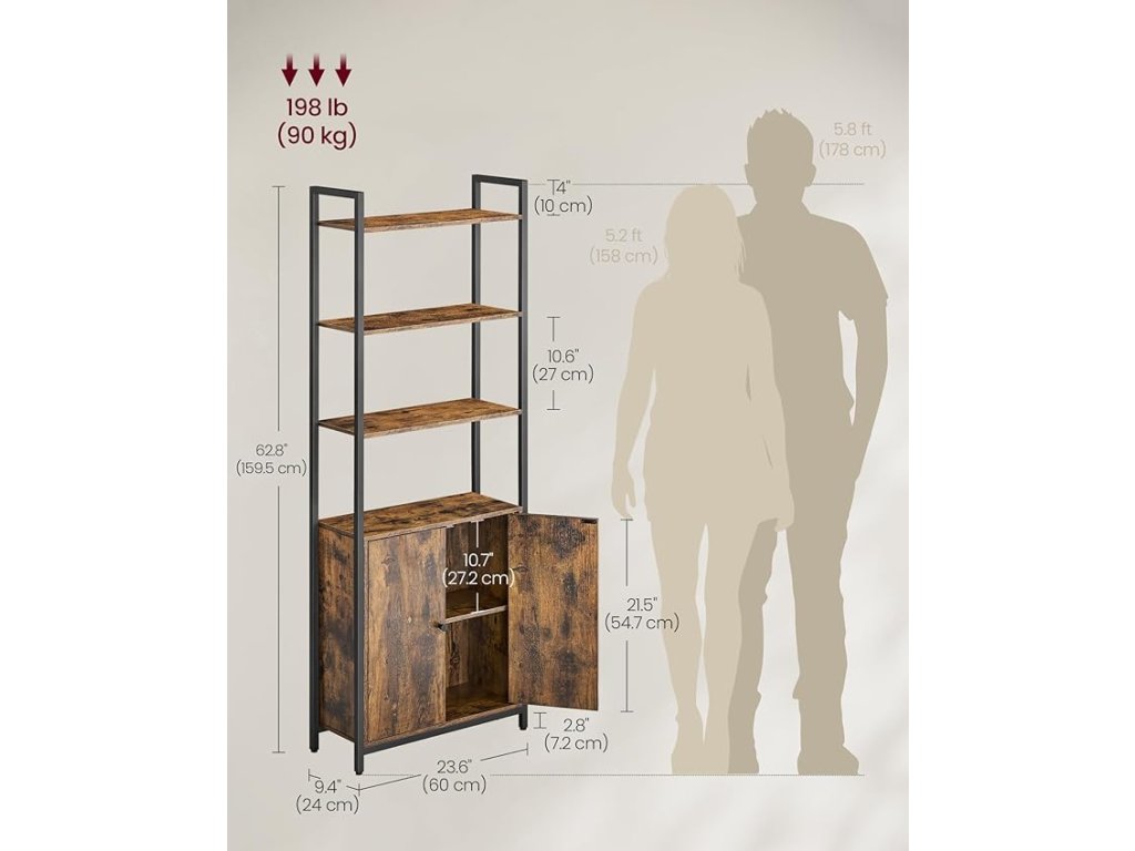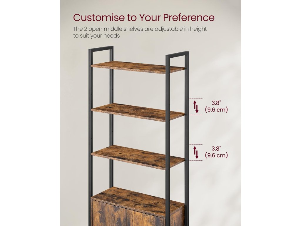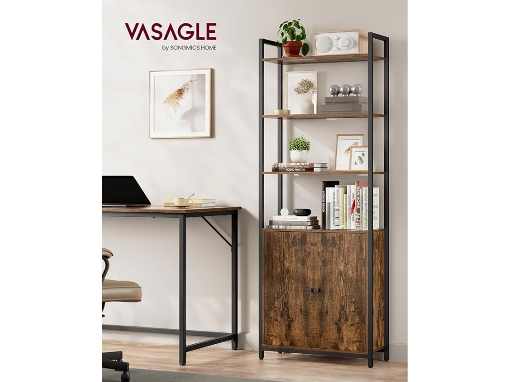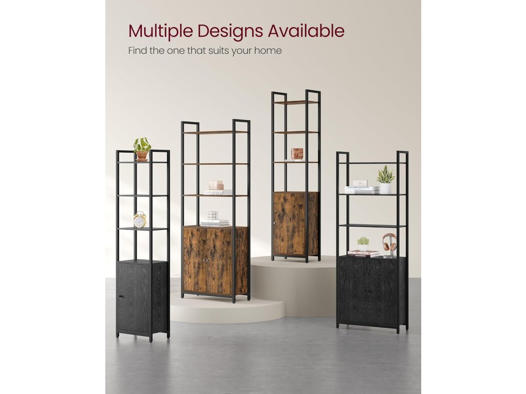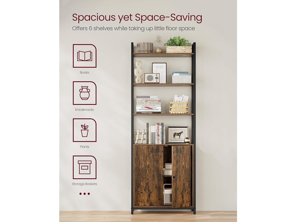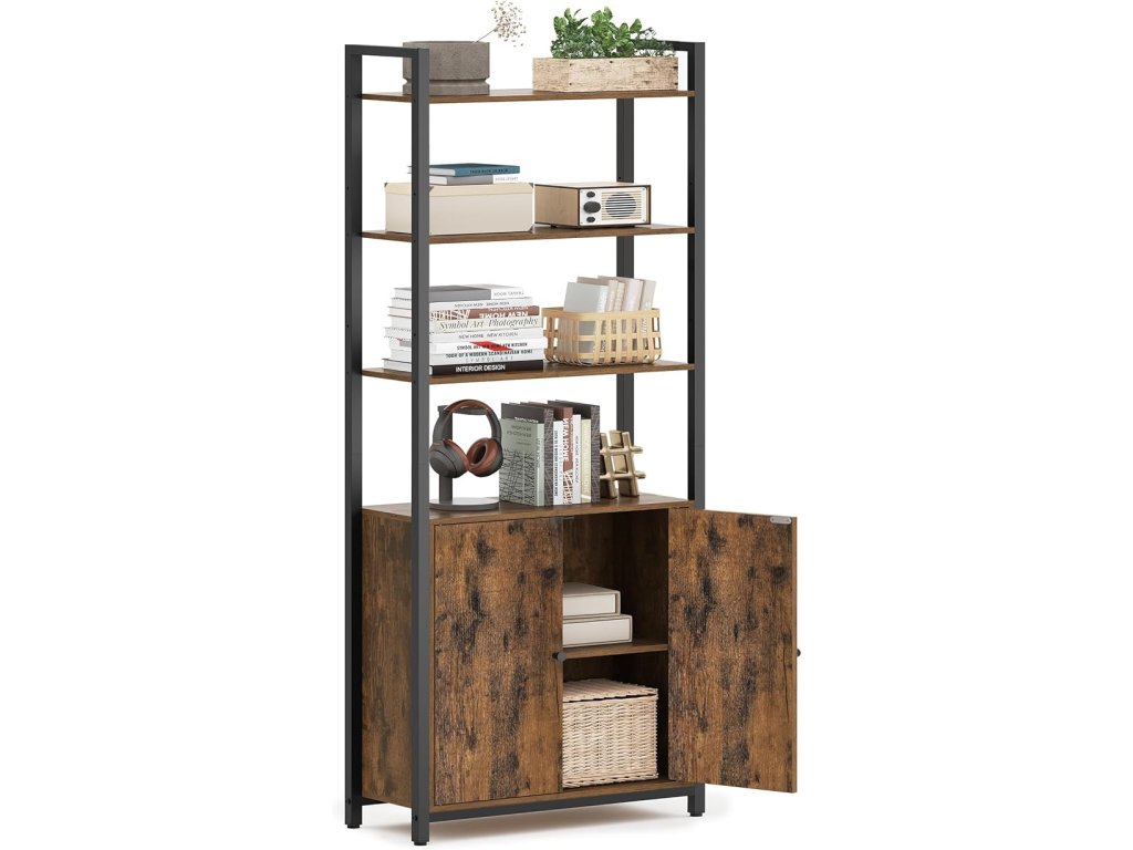 6-patrová knihovna, vysoká police s dvířky, kovový rám, nastavitelné police, 24 x 60 x 159,5 cm, obývací pokoj, ložnice, rustikální hnědá a inkoustově černá.