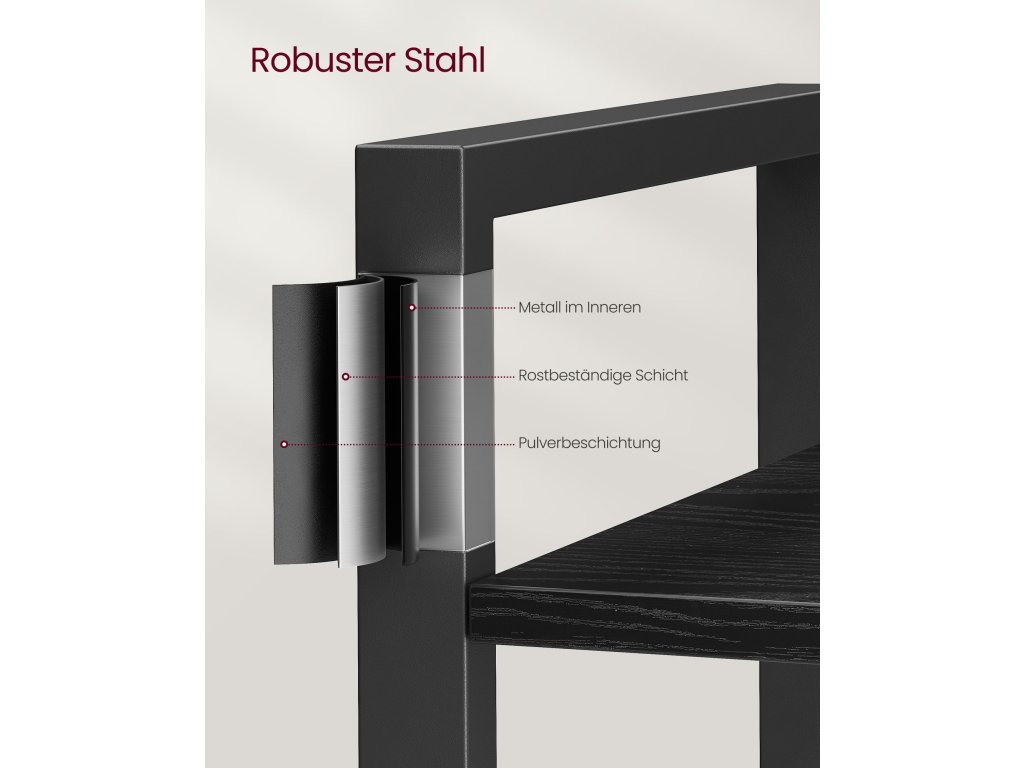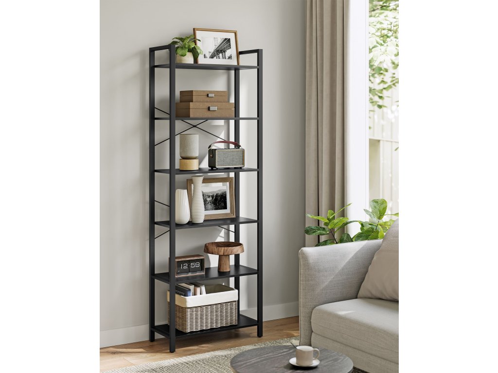 6-patrový vysoký regál, velká knihovna, ocelový rám, volně stojící policová jednotka do obývacího pokoje, ložnice, domácí kanceláře, pracovny, 30 x 66 x 186 cm, industriální, černá ebenová a černá inkoustová.