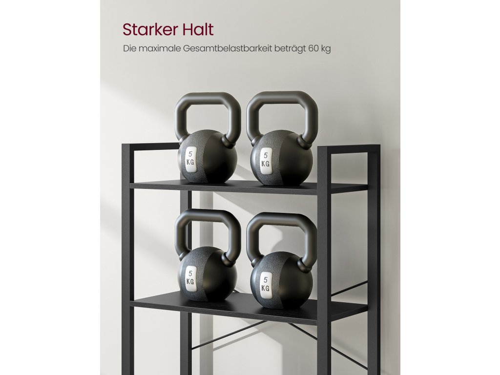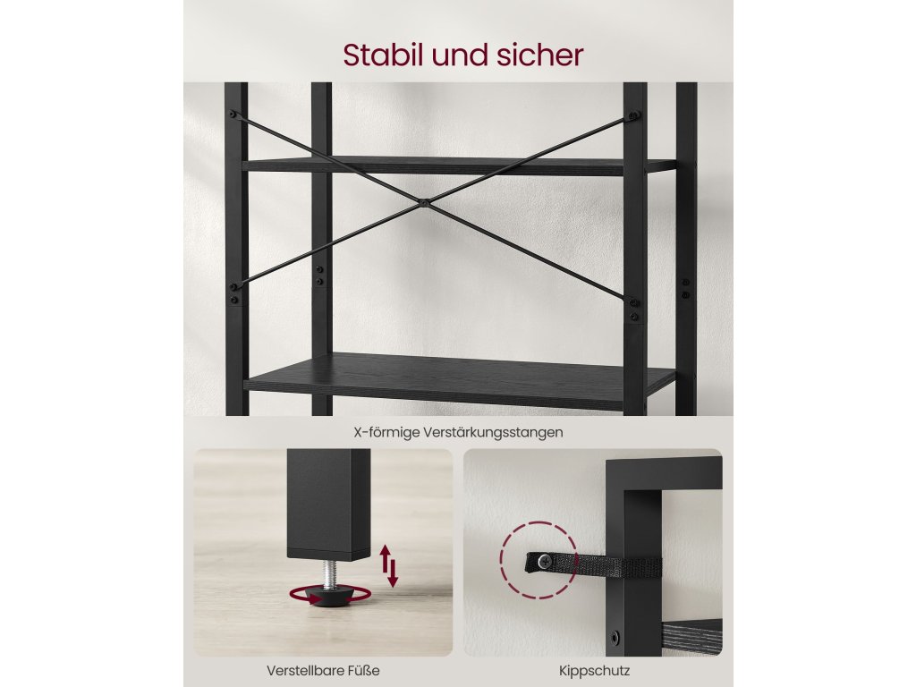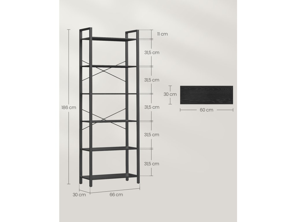 Dostatek úložného prostoru pro každou místnost Tento regál s šesti otevřenými policemi o rozměrech 30 x 66 x 186 cm nabízí dostatek úložného prostoru pro vystavení vašich oblíbených knih, dekorací a rostlin v obývacím pokoji, ložnici nebo bytě. nebo studovatVyrobeno pro dlouhou životnost Tato šestipatrová knihovna kombinuje kvalitní dřevotřískové desky s robustním ocelovým rámem a může se pochlubit maximální nosností 60 kg, což slibuje dlouholetou spolehlivou podporu.Snadná montáž Tento průmyslový regál je dodáván s označenými díly a snadno čitelným návodem, takže jej můžete rychle sestavit a během chvilky jej mít připravený k uložení knih.Stabilní a bezpečná Tyče ve tvaru X zpevňují konstrukci, nastavitelné nožičky udržují tento šestipatrový regál na knihy vyvážený na mírně nerovných podlahách. a přiložená sada proti překlopení vám pomůže připevnit ji ke zdi pro větší stabilitu a bezpečnost.| Kategorie: | Regály a poličky |