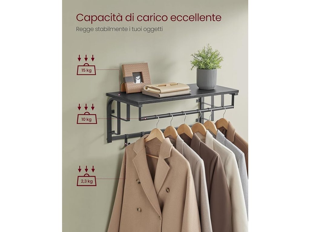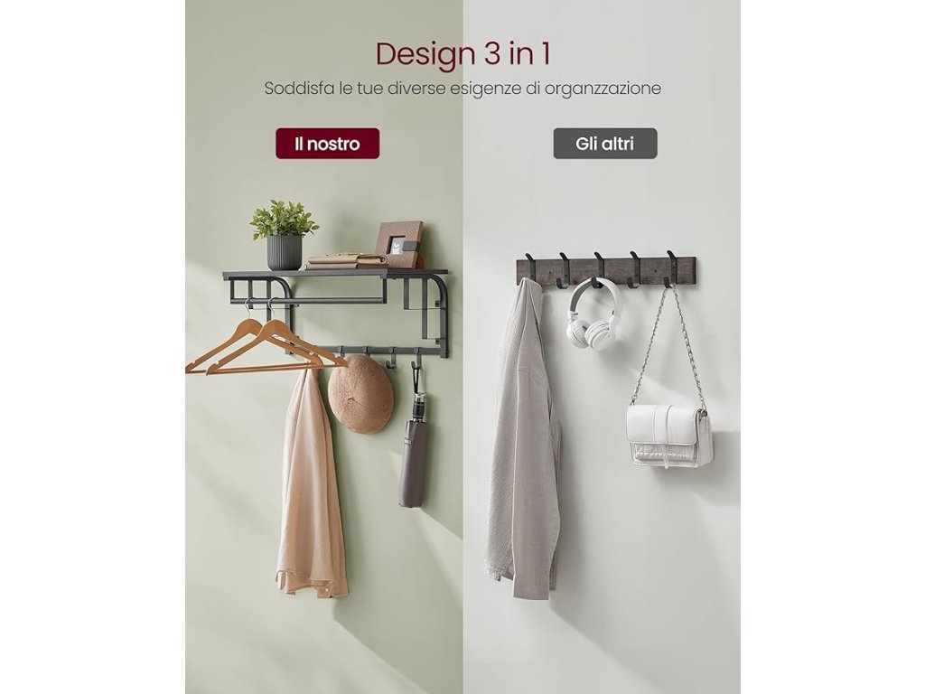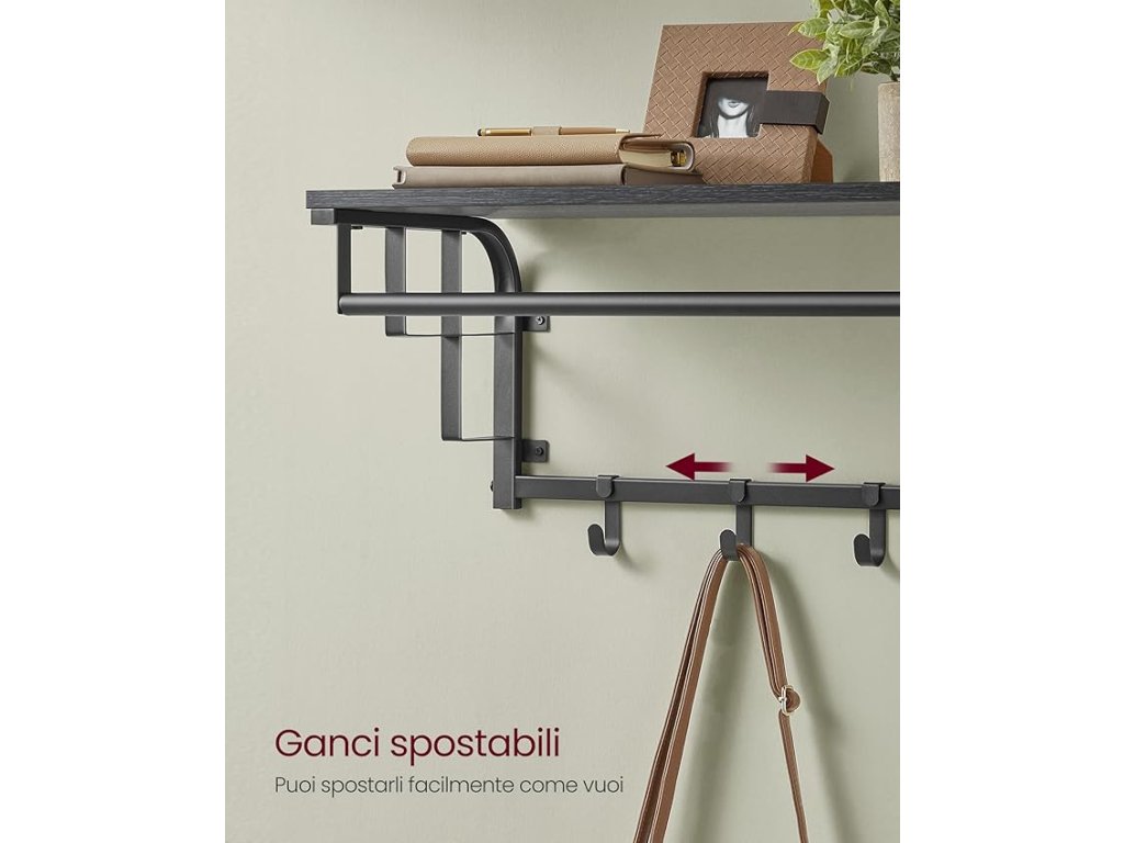 Design 3 v 1 Questo appendiabiti unisce 1 mensola da 30 x 66 cm, 1 barra appendiabiti e 5 ganci rimovibili per organizzare tutte le tue necessità. Cappotti, borse, ombrelloni, chiavi.. tutto può trovare un posto adatto.Pratico ed estetico Il design semplice il pannello essenziale e la struttura laterale unica che ti permette di aggiungere grucce danno vita a questo appendiabiti pratico per un utilizzo quotidiano ed estetico per abbellire la pareteCapacità di carico elevata Il mix tra acciaio e pannello di truciolato rende questo stabile appendiabiti in grado di reggere fino a 15 kg sulla mensola, 10 kg sulla barra e 2,3 kg su ogni gancioFacile da montare Non dovrai preoccuparti per il montaggio di questo appendiabiti da parete. Grazie a istruzioni dettagliate e parti numerate, potrai montarlo facilmente e rapidamenteCosa ricevi Un appendiabiti da muro realizzato con pannello di truciolato e acciaio, con istruzioni chiare per un facile montaggio. Migliora subito il tuo ingresso!| Kategorie: | Věšáky na zeď |