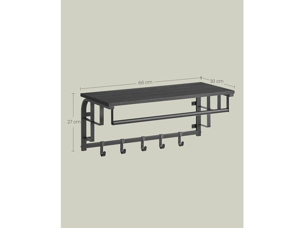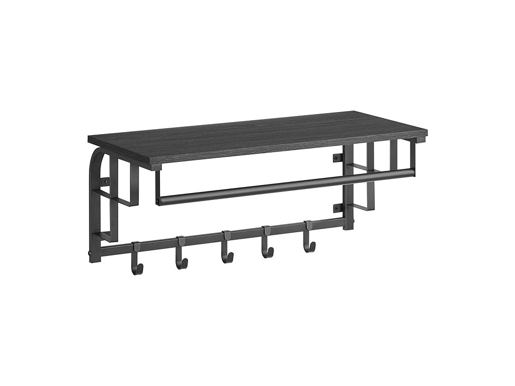 Nástěnná police s 5 háčky na oblečení, do předsíně v tmavě šedé barvě.