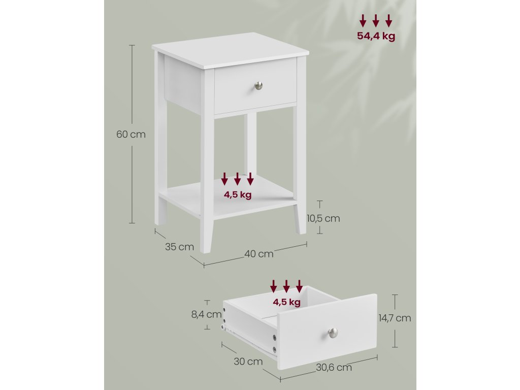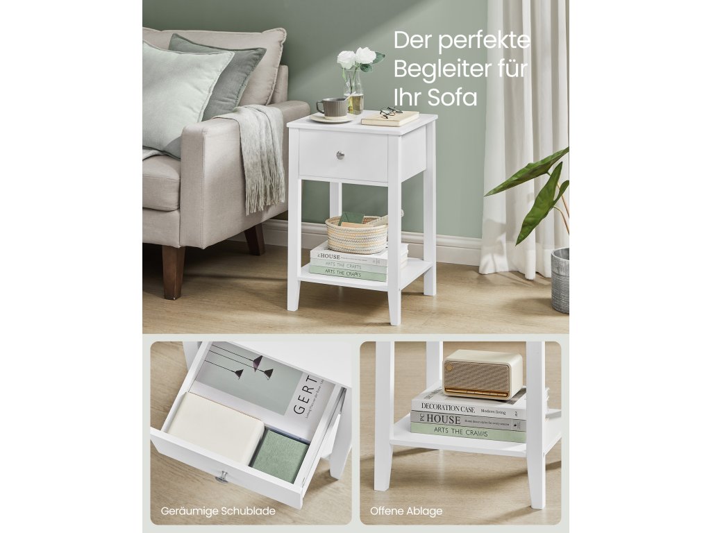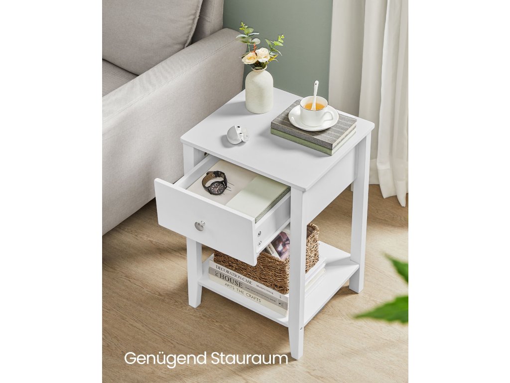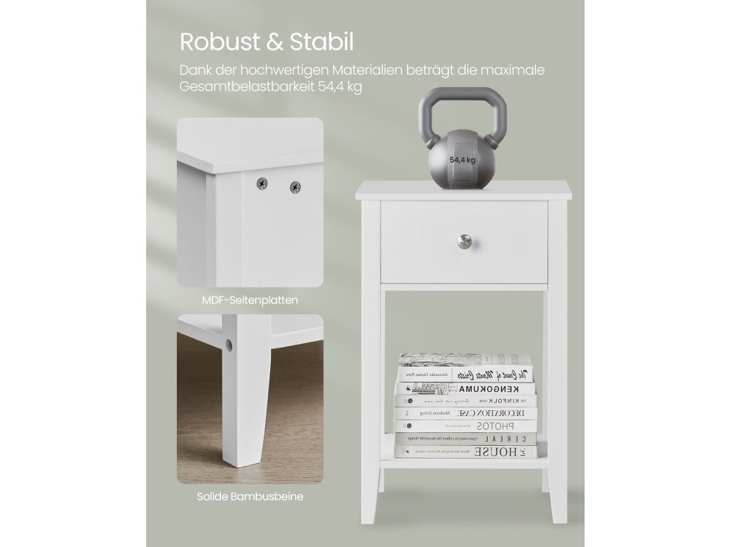 Tloušťka bambusu: díky nohám a desce stolu z přírodního bambusu je tento noční stolek mimořádně robustní a odolný. Deska stolu unese až 45,4 kg, zatímco zásuvka a police unesou každá až 4,5 kg.Minimalismus a elegance: Rozkládací stolek má čisté linie a bílou barvu, a proto platí, že "méně je více". Vyzařuje nadčasový šarm a bez problémů se hodí do každé místnosti, ať už jde o ložnici, obývací pokoj nebo jiné malé místnosti.Spousta úložného prostoru Každý postranní stolek nabízí velkou desku na lampy nebo dekorace. uzavřená zásuvka na osobní věci a otevřená police ve spodní části na knihy nebo časopisy - splňuje všechny vaše potřeby pro ukládání!Snadná péče: Díky voděodolnému lakovanému povrchu se tento konferenční stolek snadno udržuje. V případě znečištění jej stačí otřít vlhkým hadříkem, aby vypadal svěže a nově. Ušetříte tak spoustu času a úsilí.| Kategorie: | Noční stolky |