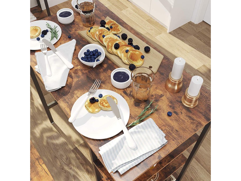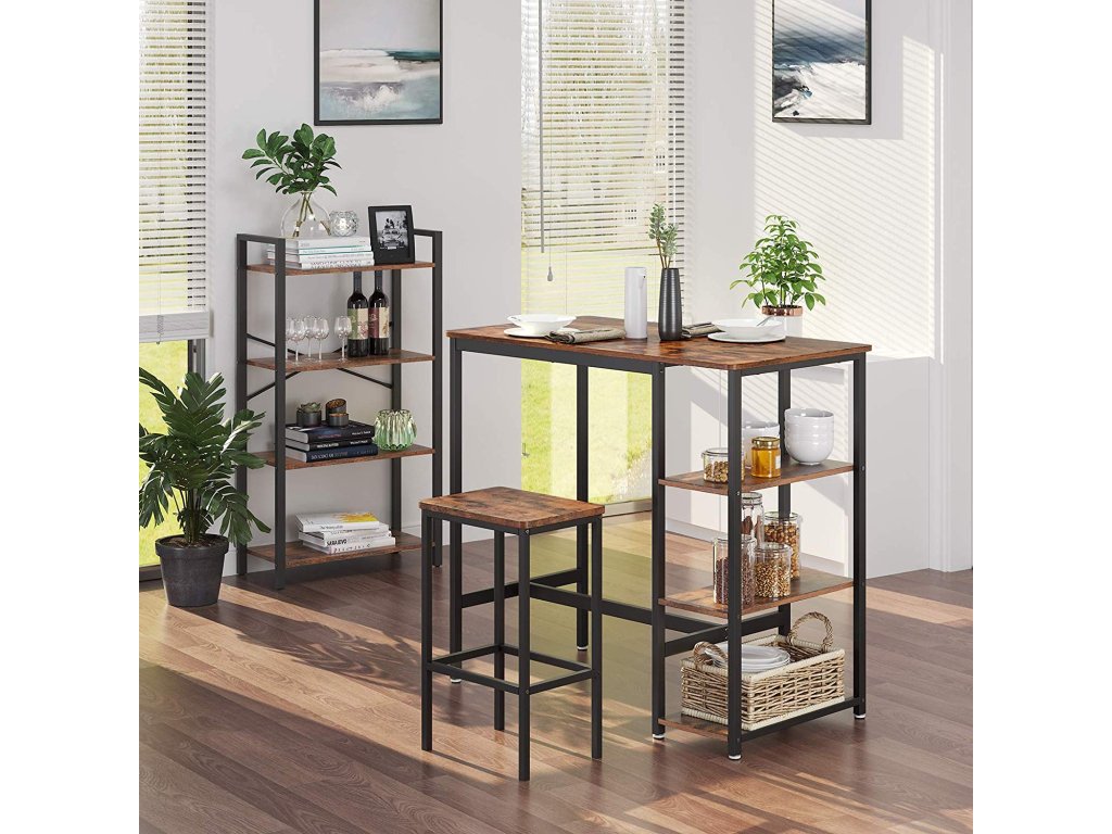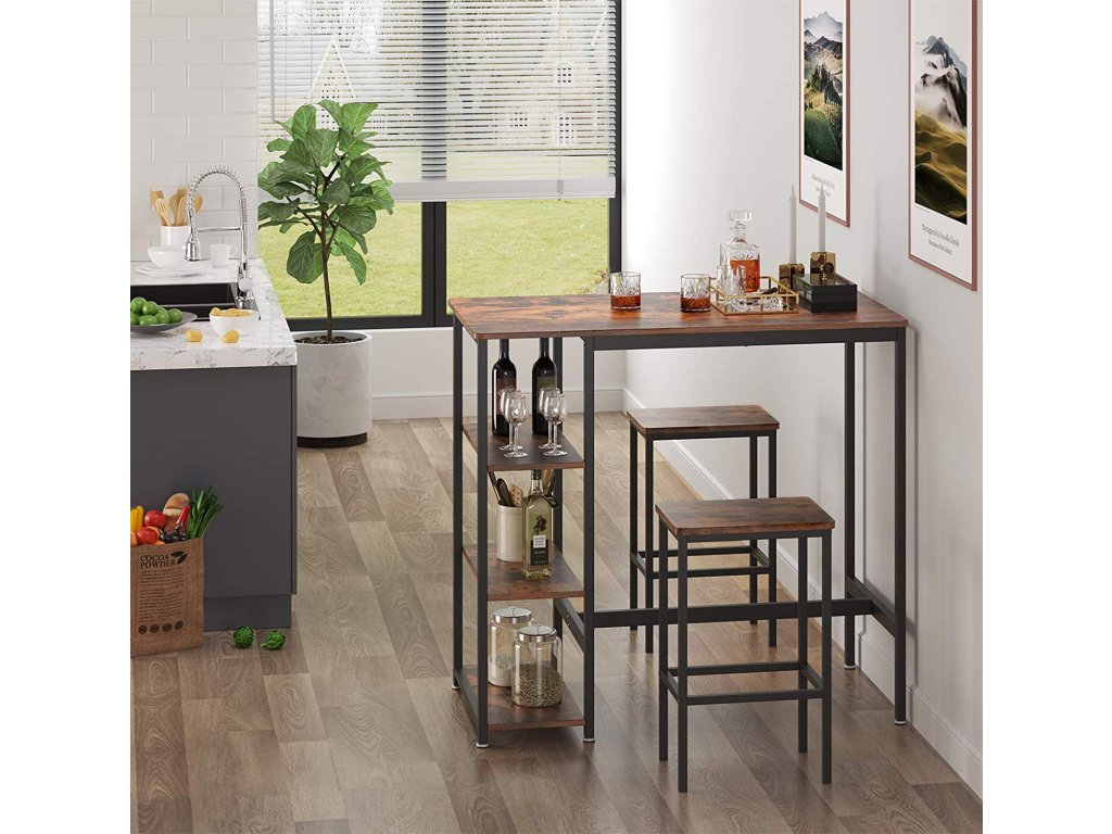 Neomezujte svou chuť k jídlu: Na velkou desku stolu o rozměrech 109 x 60 cm položte salátové mísy, zapečené těstoviny a další přílohy, notebook s oblíbeným filmem. a užijte si super oběd se svou drahou polovičkou.Tajemství stability: Tento barový pult je podepřen silnými nohami o tloušťce 20 x 30 mm a zesílenými tyčemi o tloušťce 20 x 40 mm; navíc je díky nastavitelným nožičkám stabilní i na nerovných podlahách, jako je vaše krásná dlažba;Jaká to lákavá podívaná: Tento barový stůl se 3 rustikálními policemi z hnědého umělého dřeva dodá vaší jídelně industriální nádech. Vychutnejte si lahůdky ve stylové atmosféře!Za pár minut: Díky jednoduchému návodu a očíslovaným dílům budete mít tento stůl připravený ještě předtím, než dokončíte pečení pizzy! Přidejte 2 stoličky a vychutnejte si ji, dokud je ještě horká!Další otázky? Náš profesionální zákaznický servis je vám k dispozici. Nečekejte déle a dodejte své kuchyni radost a vkus tímto barovým stolkem z kolekce ALINRU!