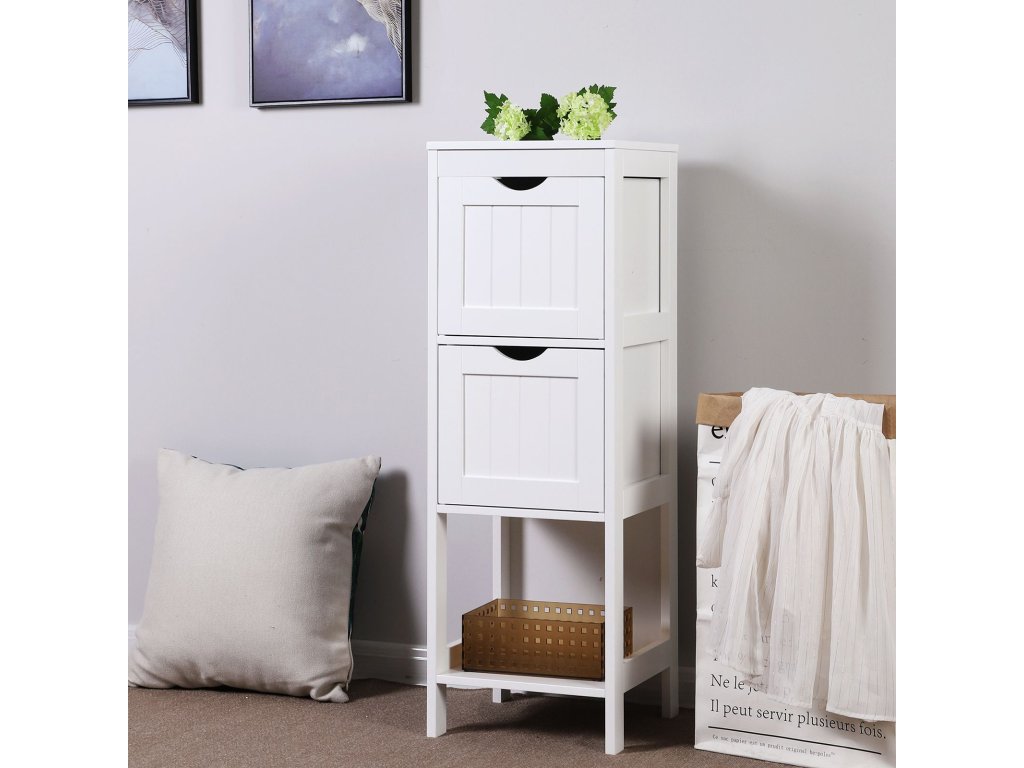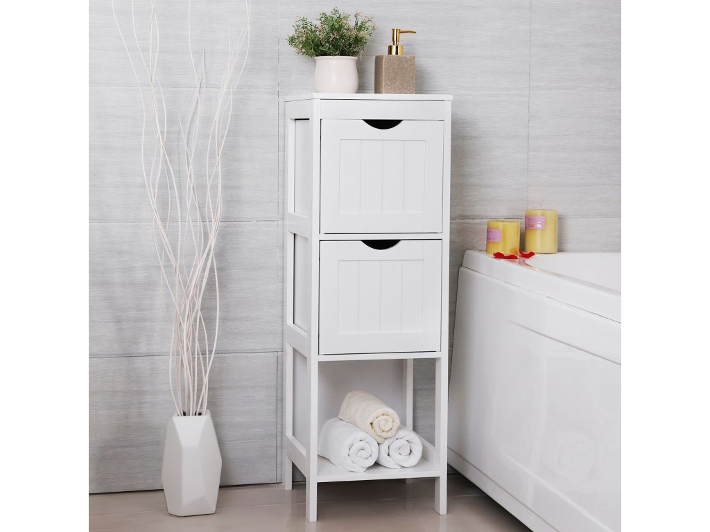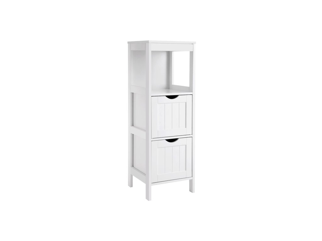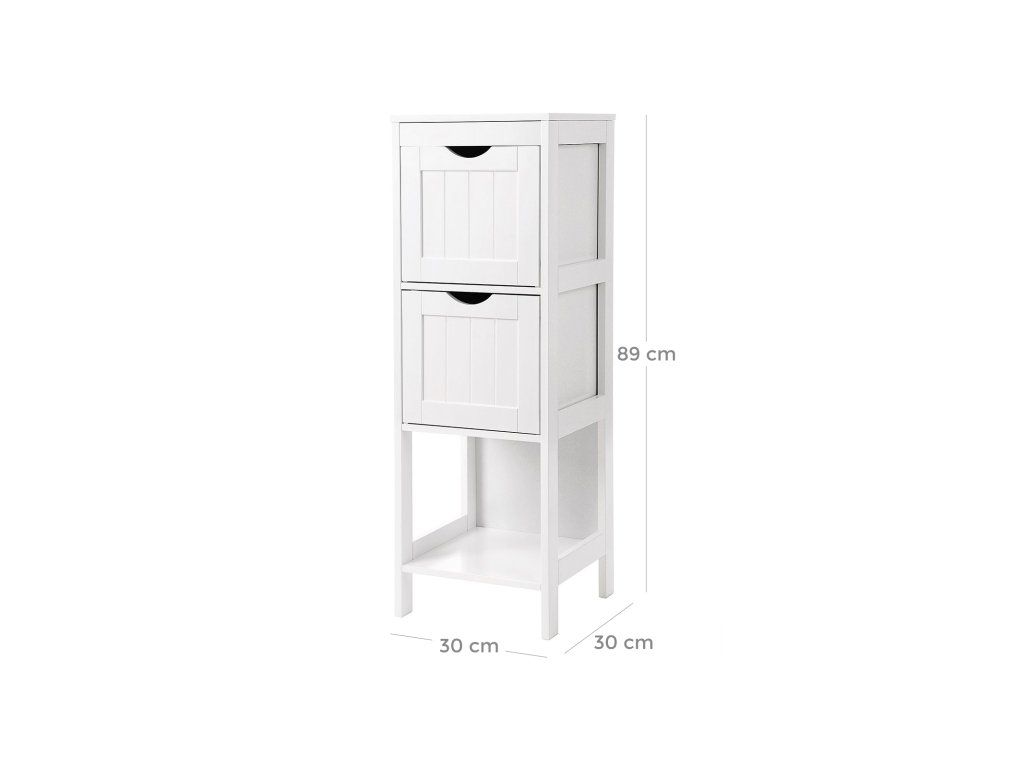 Rohový noční stolek, skříňka na léky do koupelny, dřevěná 1 otevřená přihrádka, 2 zásuvky, 30 x 89 x 30 cm, bílá.