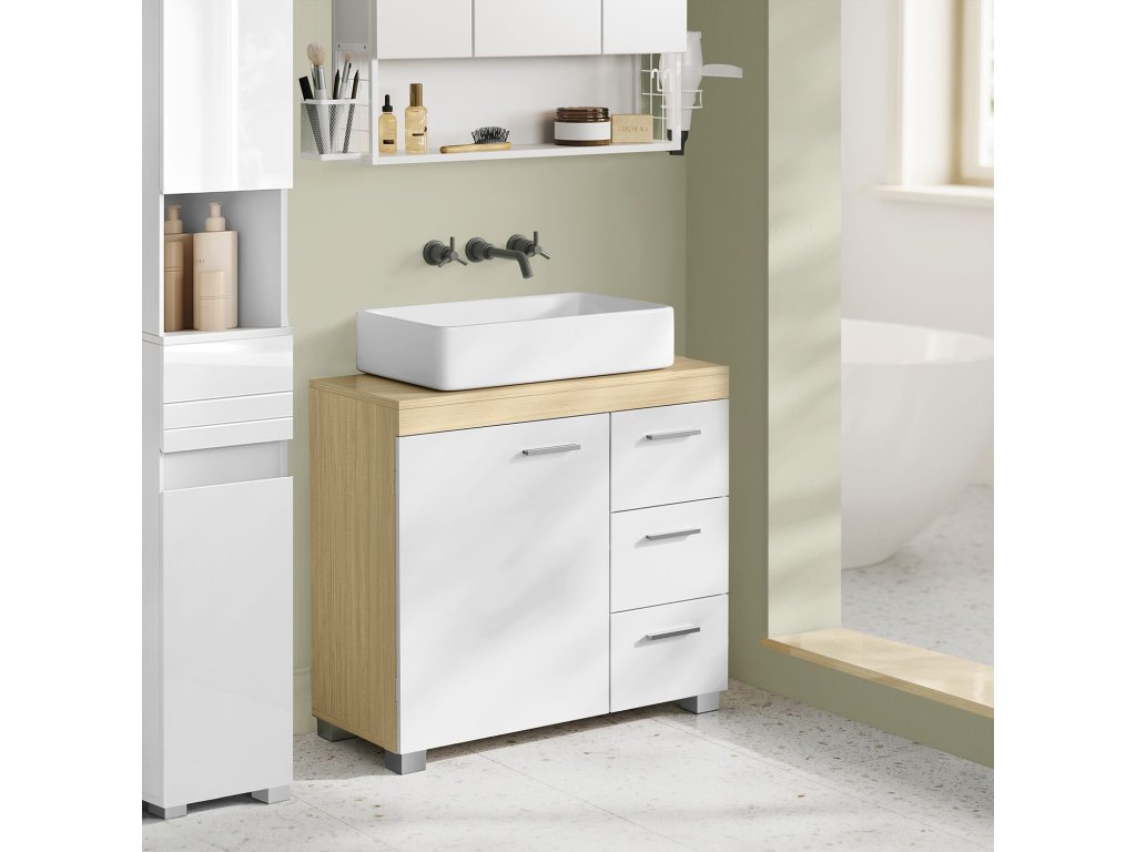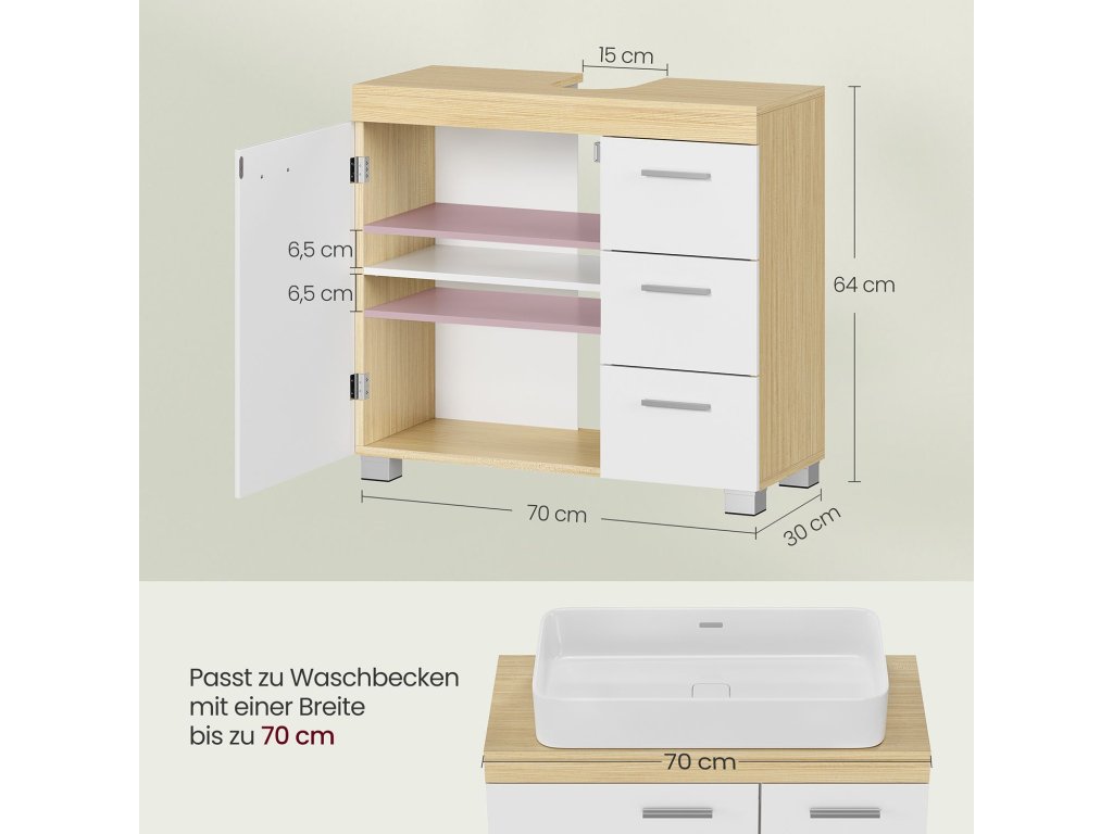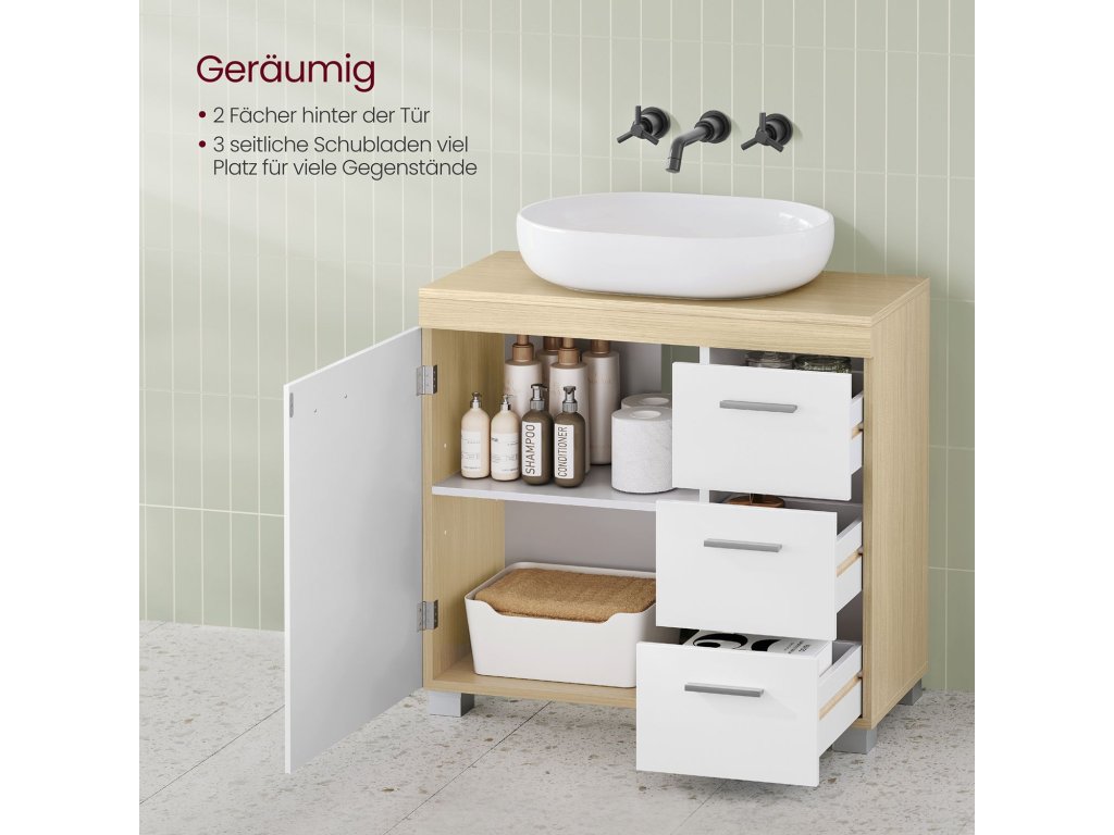 Toaletní skříňka se 3 velkými zásuvkami, koupelnová skříňka, 2 přihrádky za dveřmi, koupelnová skříňka s nožičkami, 30 x 70 x 64 cm, bílá, přírodní.