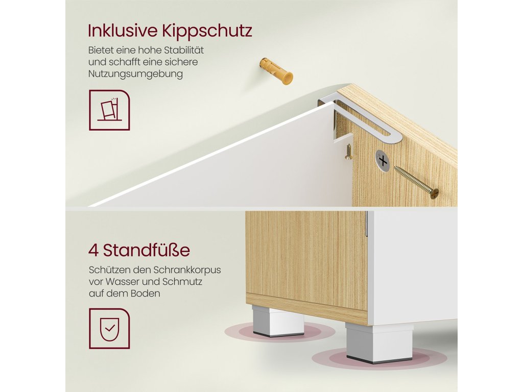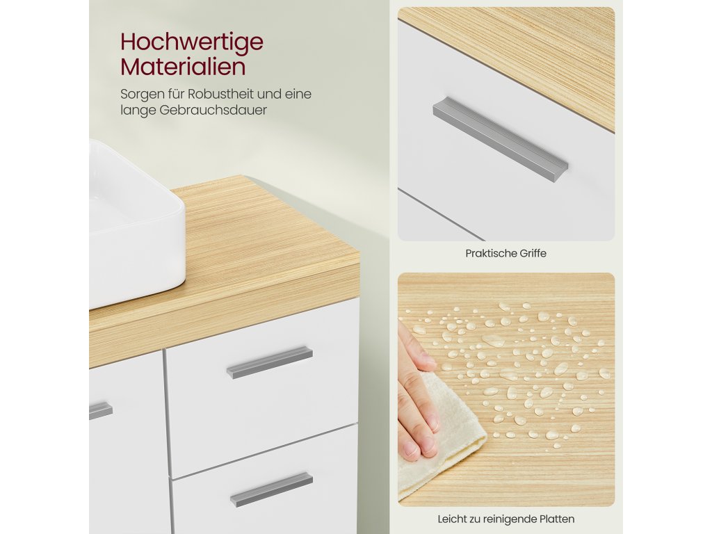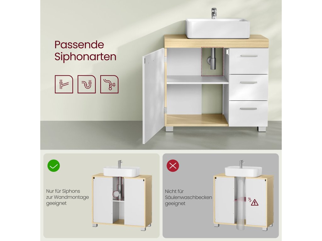 Dostatek úložného prostoru 3 boční velké zásuvky, 2 přihrádky za dvířky skříňky - tato skříňka pod umyvadlo vám poskytne dostatek úložného prostoru pro přehledné uložení koupelnového náčiní, ručníků atd. Výškově nastavitelná police a praktické úchyty: Polička ve skříňce je nastavitelná do 3 úrovní, takže do ní můžete uložit různé velikosti lahví se šamponem a sprchovým gelem. Dvířka skříněk a zásuvek lze snadno otevírat díky úchytkám. [Robustní a stabilní] Tato koupelnová skříňka vyrobená z vysoce kvalitních MDF desek je odolná a bude vás provázet po mnoho let. Uzavřené ochranné díly proti naklonění dodávají koupelnové skříňce větší stabilitu. Snadná montáž: označené díly a srozumitelný, ilustrovaný návod (čeština není zaručena) usnadňují montáž této úložné skříňky. Poznámka: Vezměte prosím na vědomí rozměry skříňky, výřez pro sifon a vzdálenost mezi nastavitelnou policí a základnou, abyste se ujistili, že se skříňka do základny vejde. Není vhodný pro umyvadla s umyvadlovým sloupem.| Kategorie: | Koupelnový nábytek |
