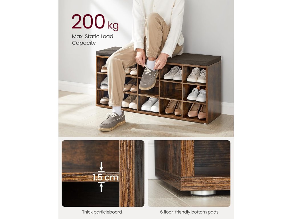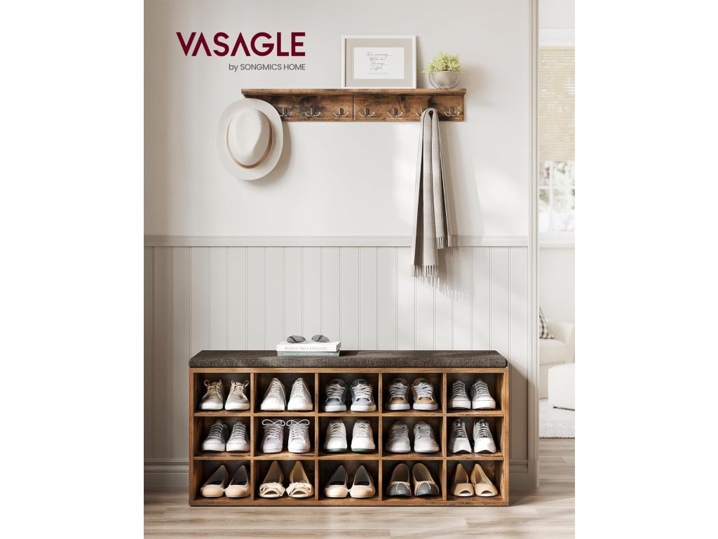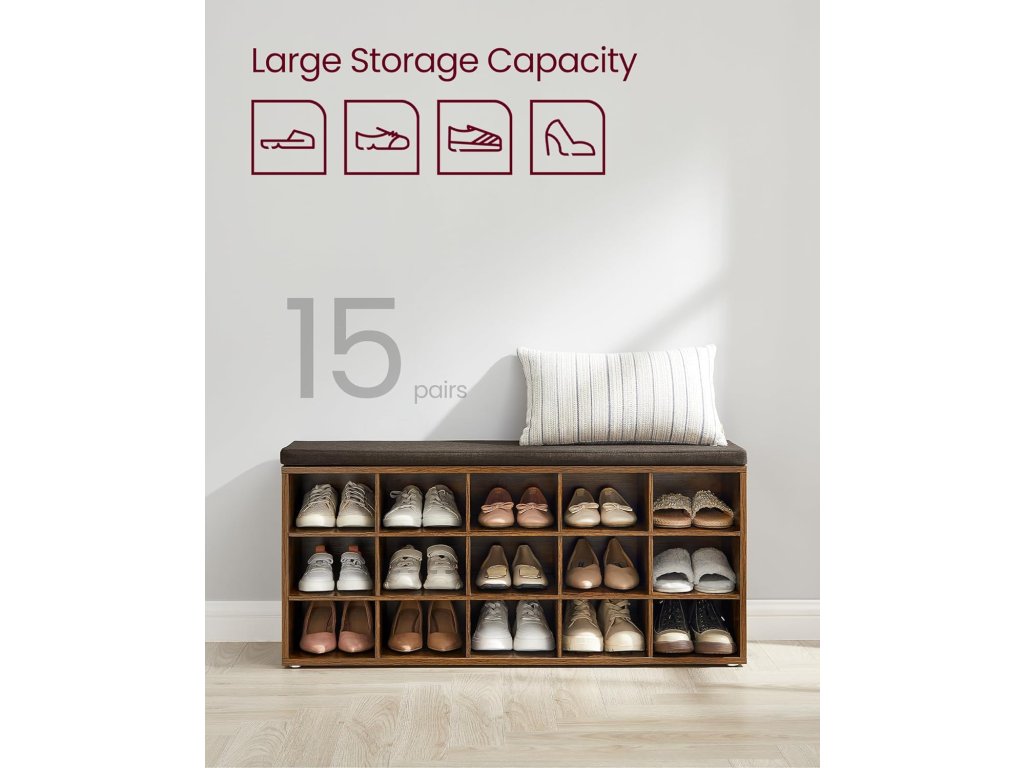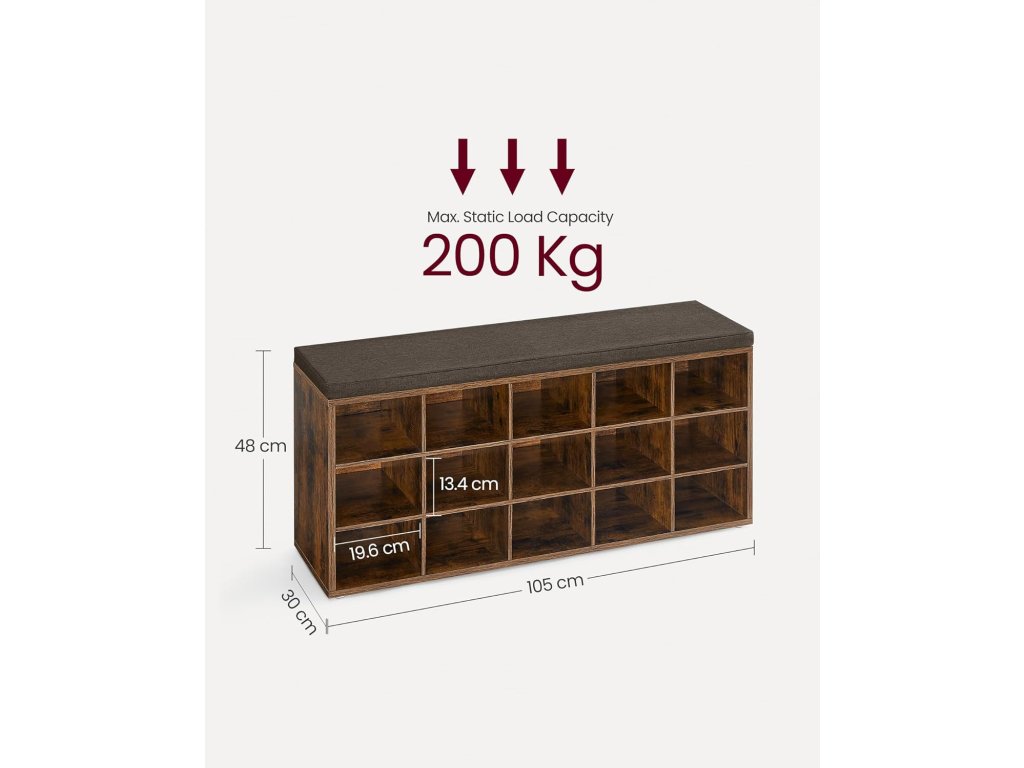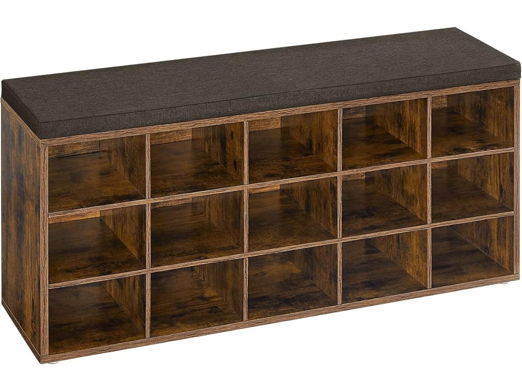VASAGLE Botník, lavice na boty se sedátkem, botník s polštářem, 15 otevřených přihrádek, 30 x 105 x 48 cm, do předsíně, ložnice, obývacího pokoje, rustikální hnědá.