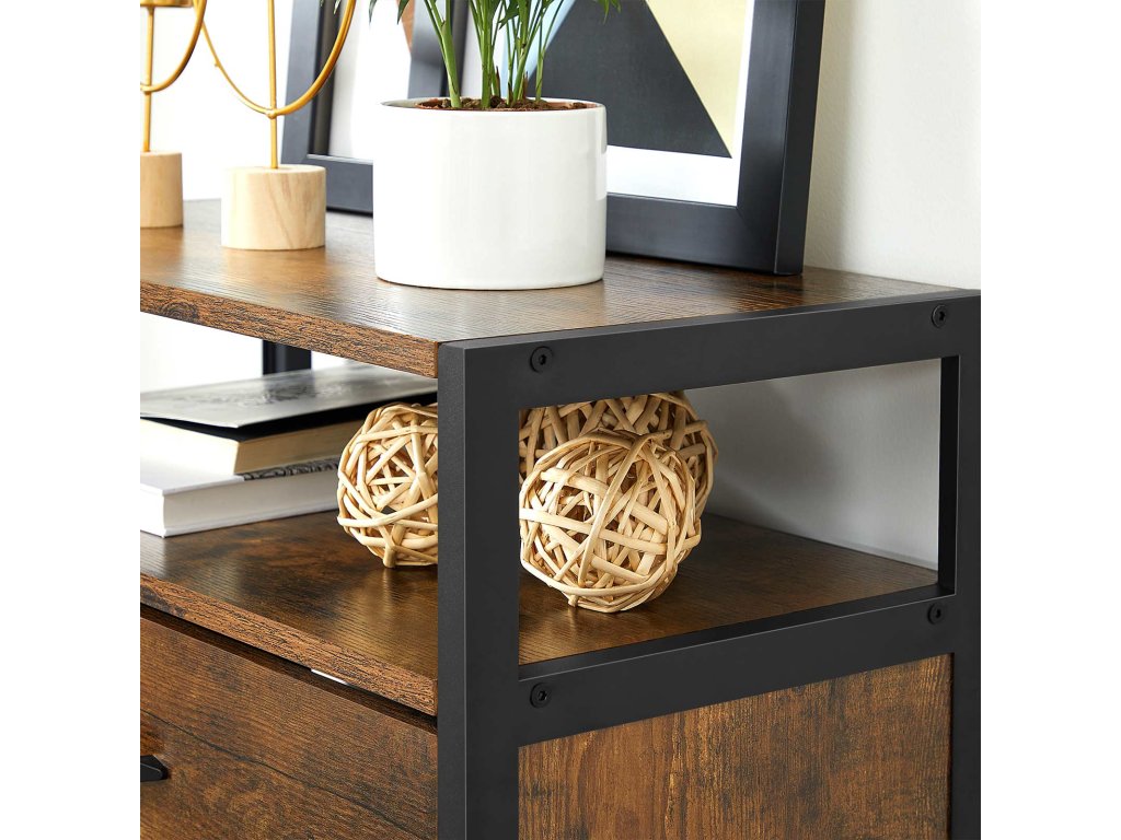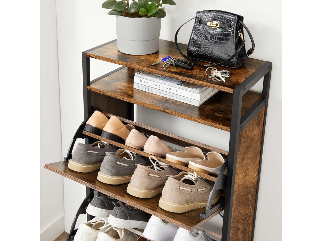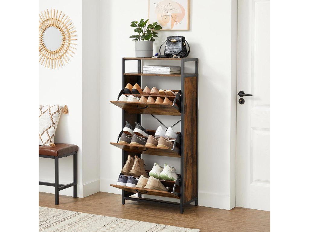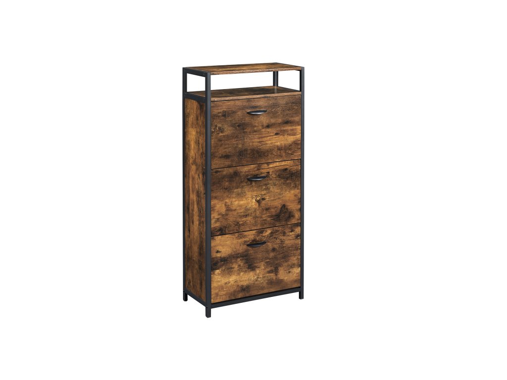 Botník se 3 výklopnými dveřmi, úložný regál s otevřenými přihrádkami, vnitřní rozdělovače, pro 15-18 párů bot, 60 x 30 x 130 cm, rustikální hnědá a černá.